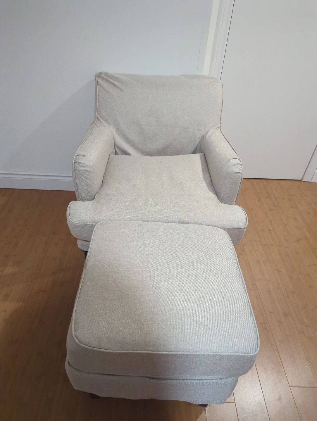 Selling a comfy armchair and ottoman set! It's a light beige colour that would fit in with any decor. Perfect for relaxing and putting your feet up after a long day