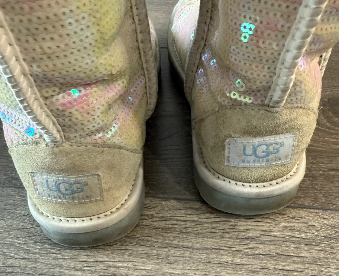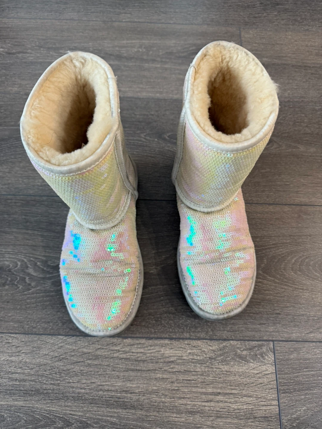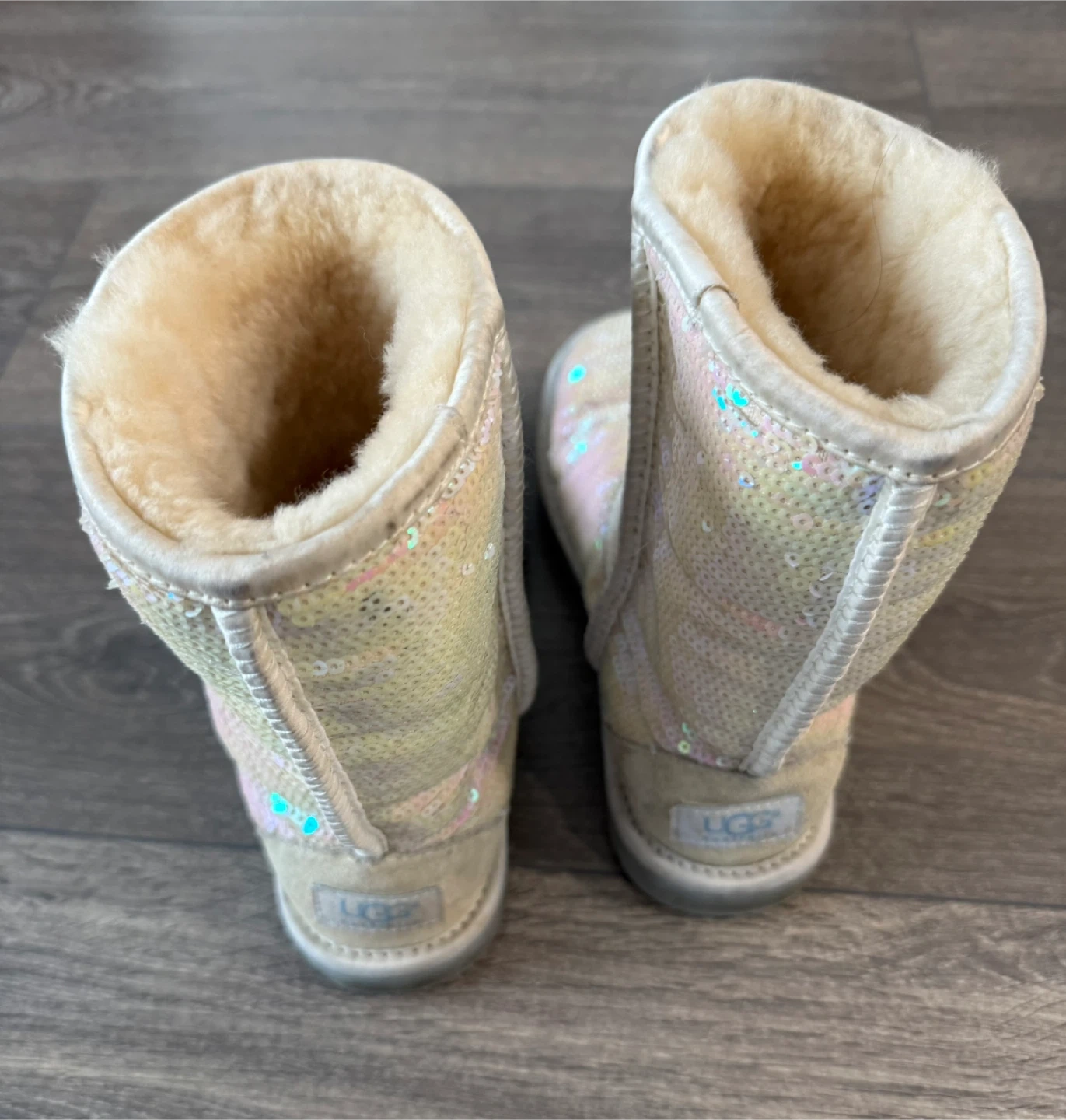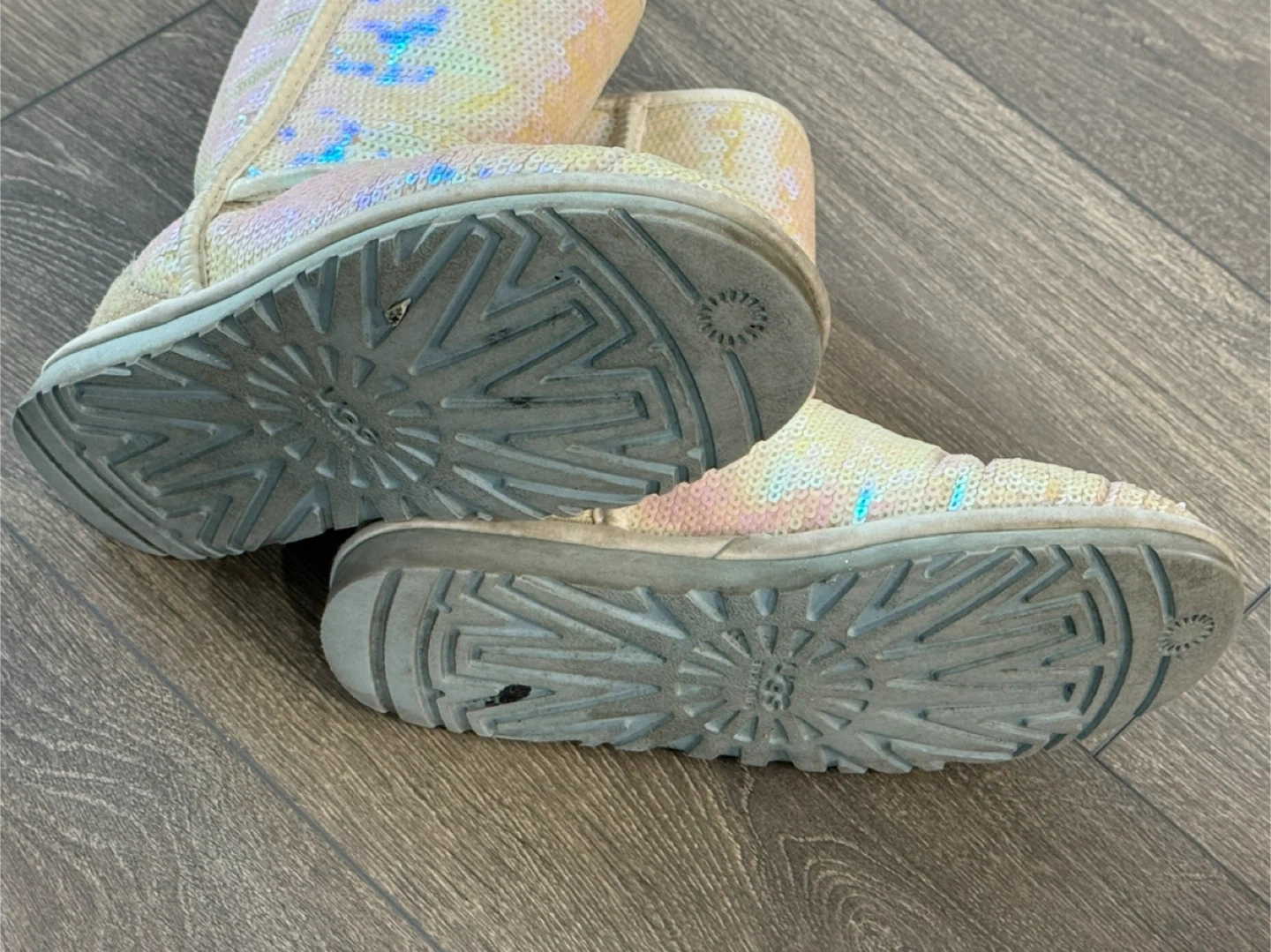 Cute UGG boots with sequins! They are a size 6 and have a cozy lining. Perfect for adding a bit of sparkle to your outfit!