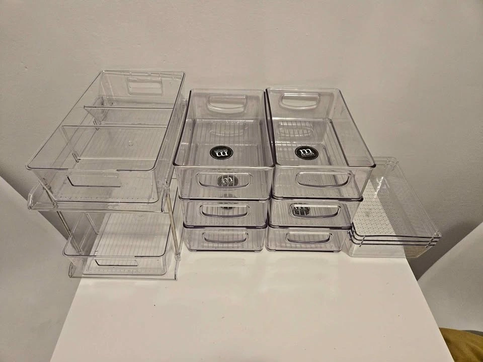Set of clear plastic drawer organizers in different sizes. Great for kitchen, pantry, fridge, bathroom, or office organization. All in excellent condition.
