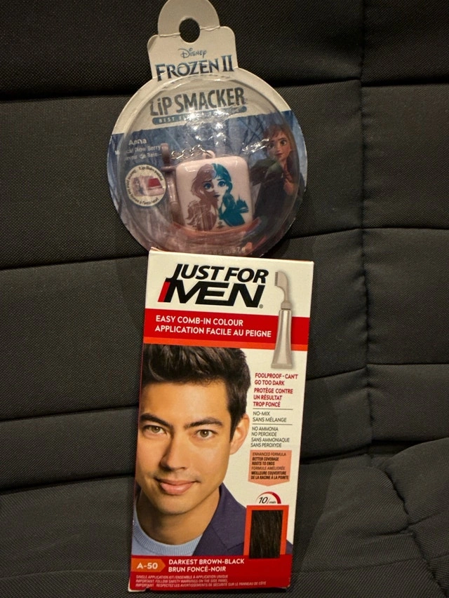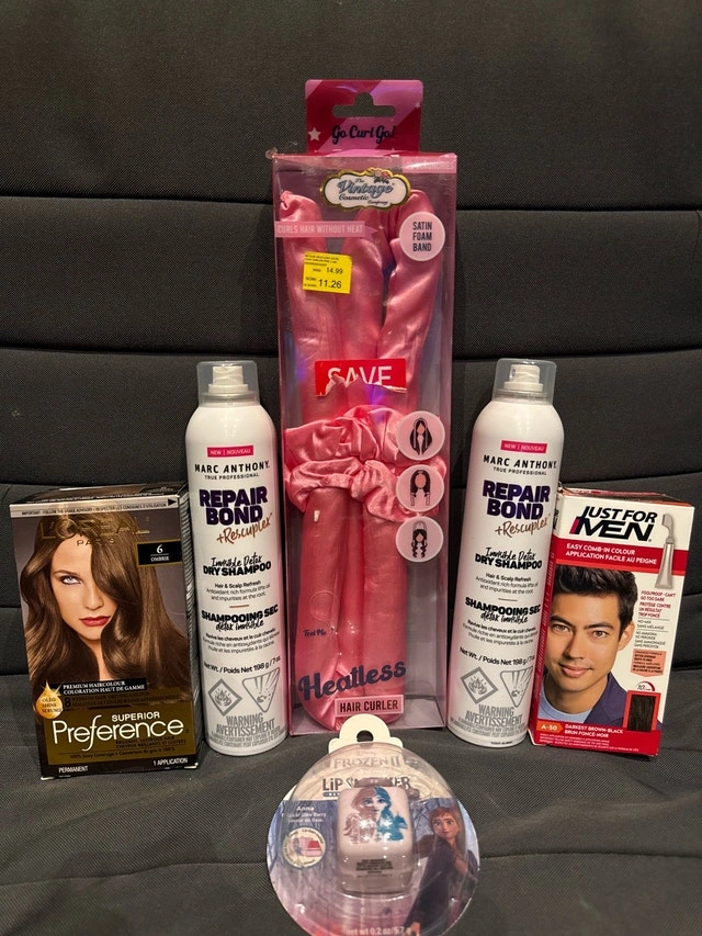 This bundle features a mix of hair products to keep you looking your best! It includes L'Oreal Paris Preference Ombre hair colour in shade 6, two bottles of Marc Anthony Repair Bond Invisible Detox Dry Shampoo, Just For Men Easy Comb-In Colour in darkest brown-black A-50, a heatless hair curler, and a Disney Frozen II lip smacker. All items are new and ready for a new home! Entire bundle is only $5 !