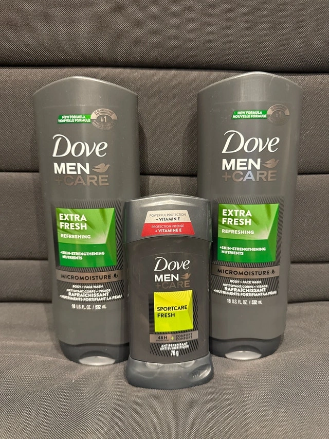 This Dove Men+Care set includes two 532 mL bottles of Extra Fresh body and face wash, and one SportCare Fresh antiperspirant stick (76g). This set is new and provides a refreshing clean. Take them all for only $5