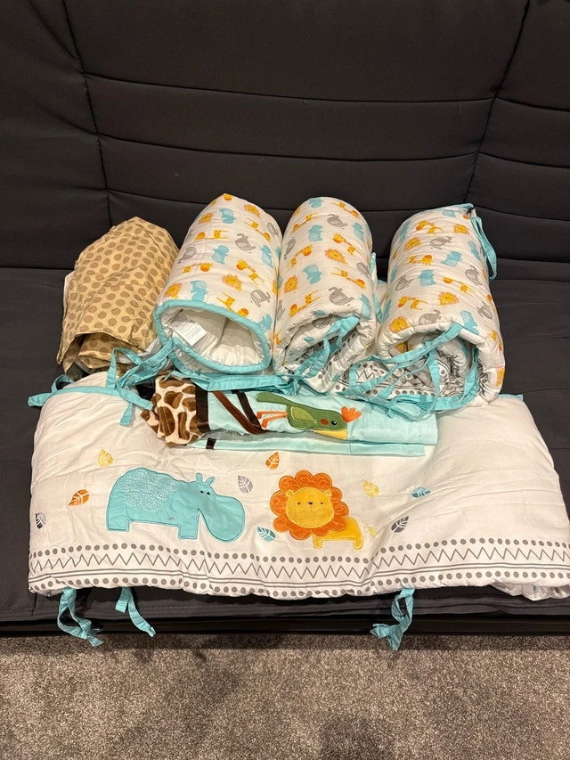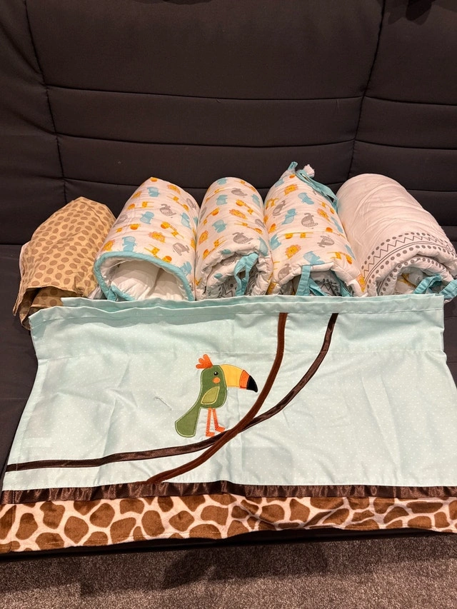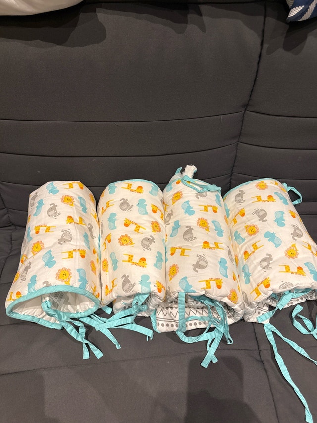 * Bumpers: Four-piece set for full crib coverage with matching patterns * Window Valance: Accented with giraffe pattern