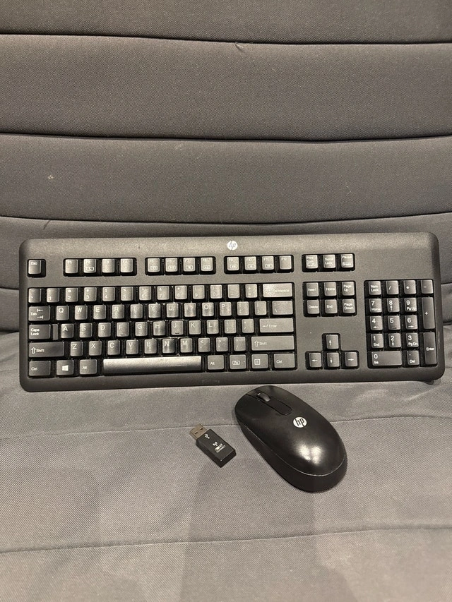This HP wireless keyboard and mouse combo is in used condition, perfect for enhancing your home or office setup. The set includes a wireless keyboard, a wireless mouse, and a USB receiver for easy connectivity.