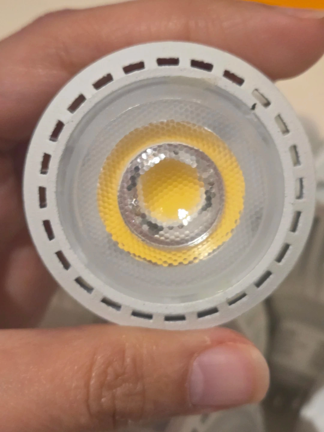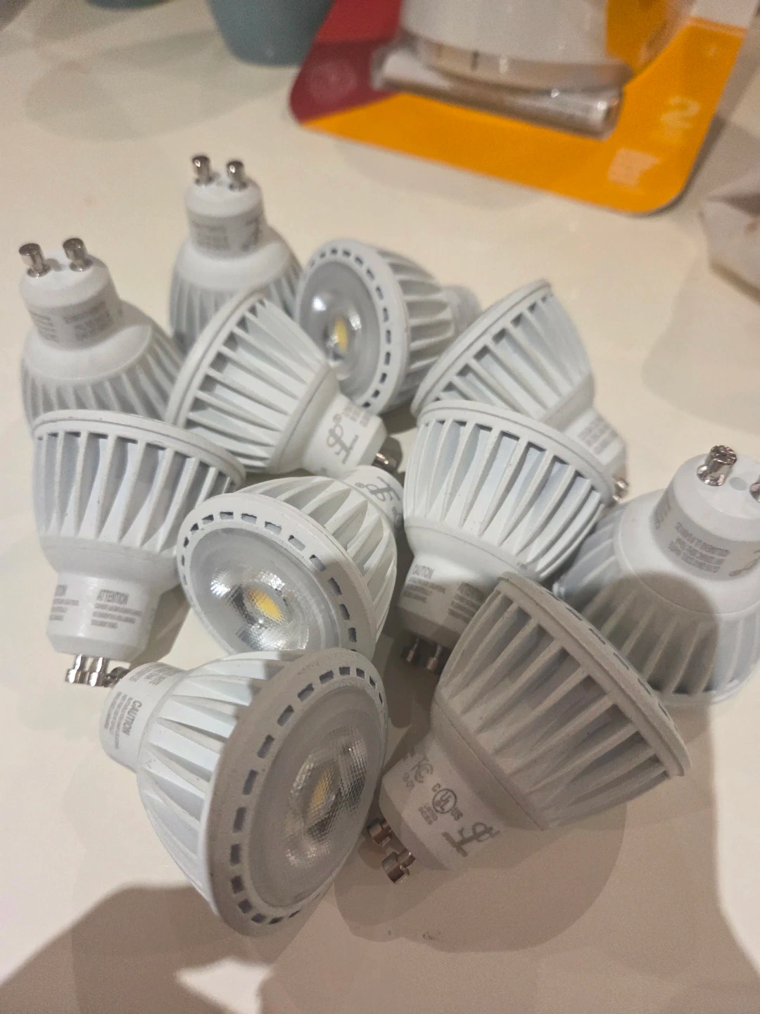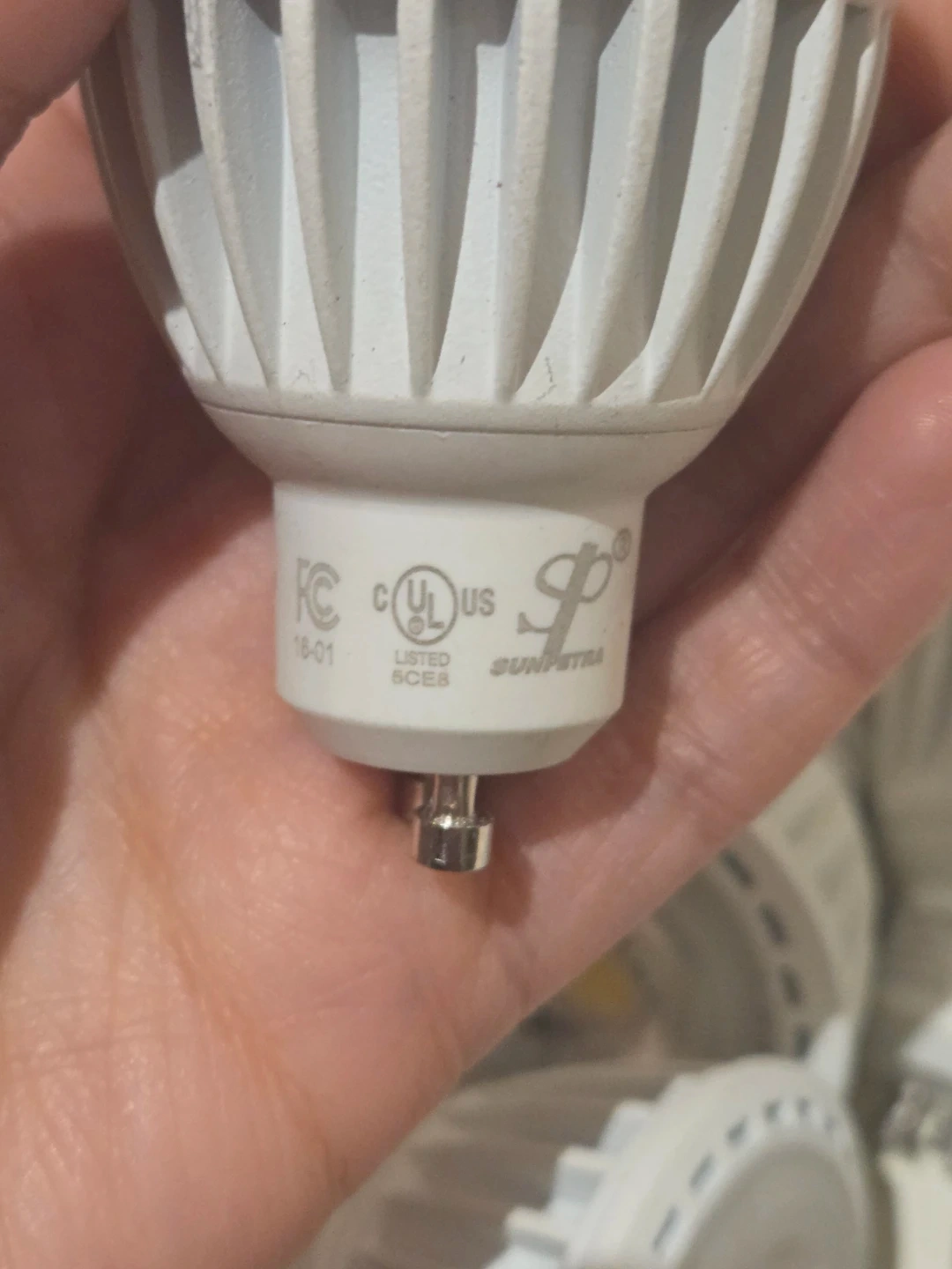 SunPetra GU10-DM-6 LED light bulbs. They're cool white. Each bulb is 6W, 120VAC 60Hz 70mA, and 420 Lumens.