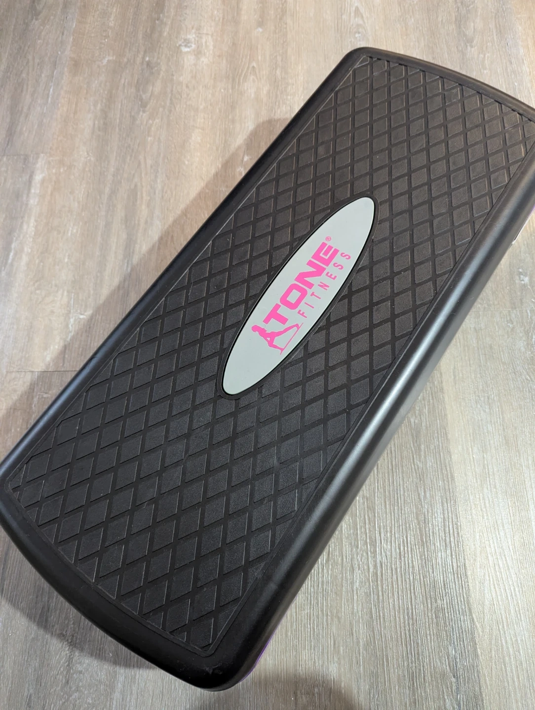 It's in great shape and ready for your home workouts. The step includes two risers of 4in or 6in so you can adjust the height to your liking and non slip surface.