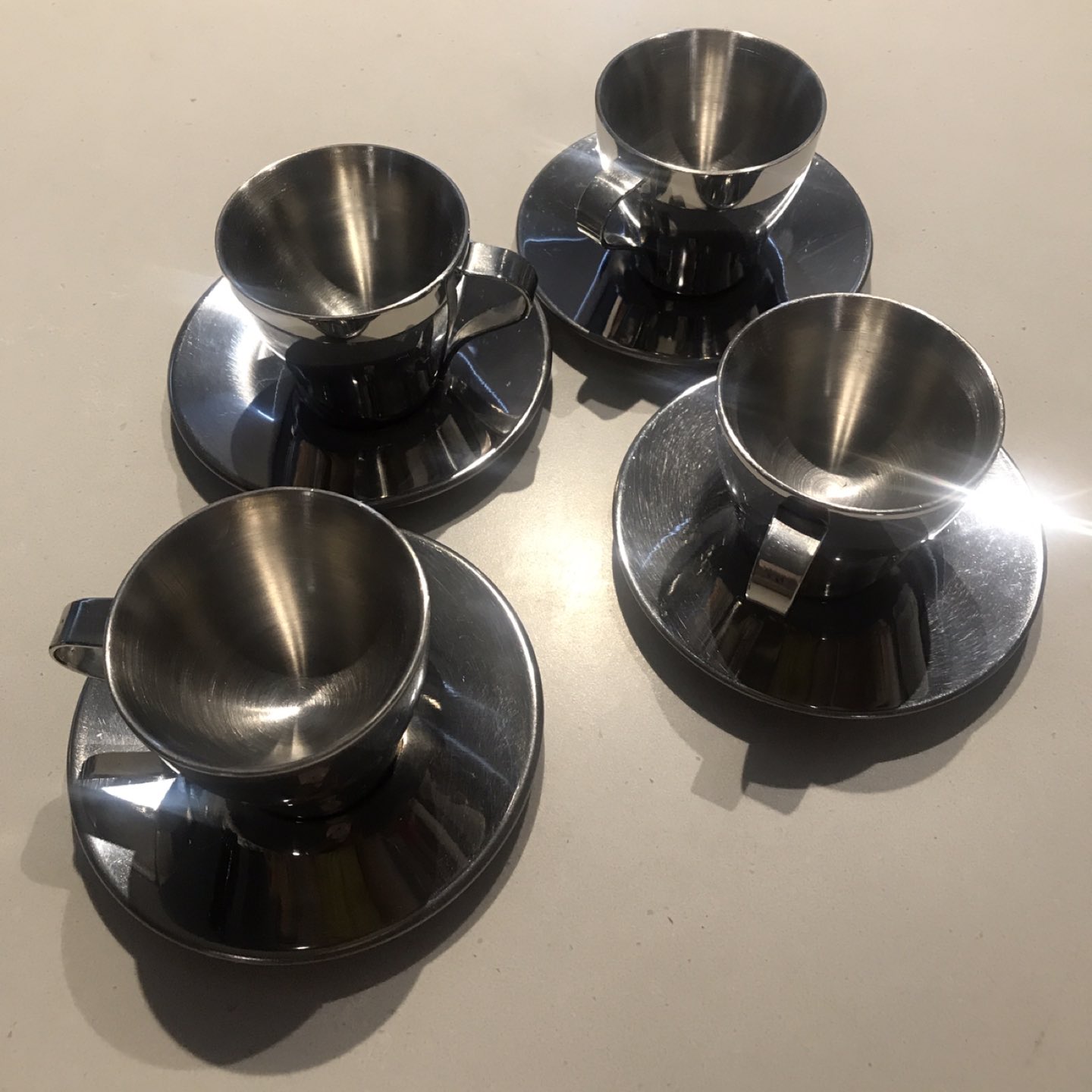 - 4 sets of IKEA stainless steel espresso cup and saucers.