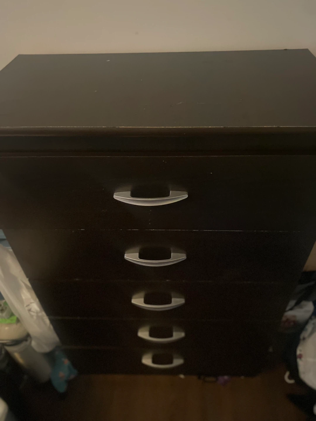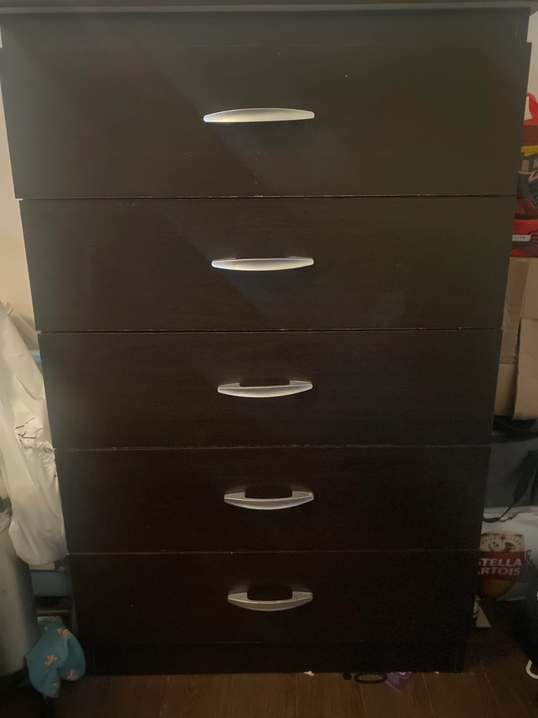 Selling a dark brown 5-drawer chest. It's perfect for adding storage to any room in your home. The drawers slide smoothly and the chest is in good condition