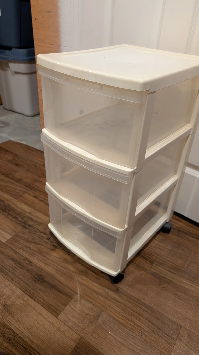 This is a handy 3-drawer rolling storage cart, perfect for organizing your space. It's in great shape and ready to help you tidy up your home or office. The drawers are clear, so you can easily see what's inside, and the rolling wheels make it easy to move around, dimensions are 16"deep,13"wide,27 high.