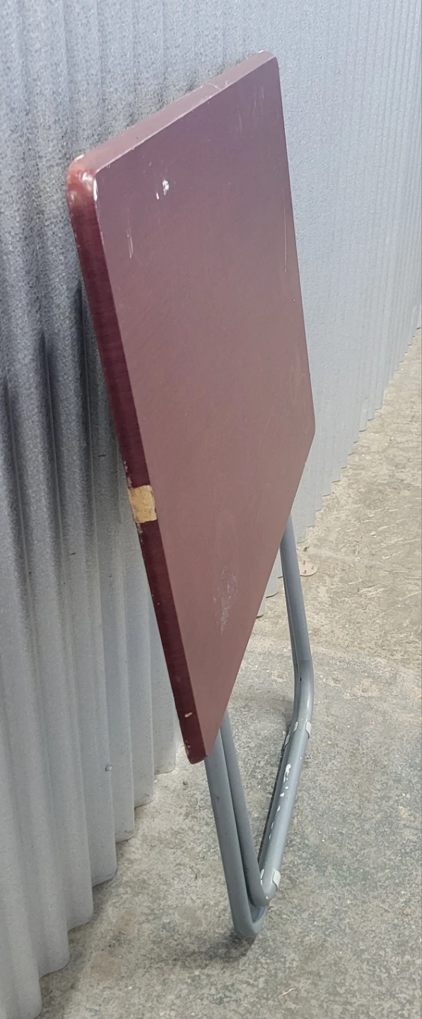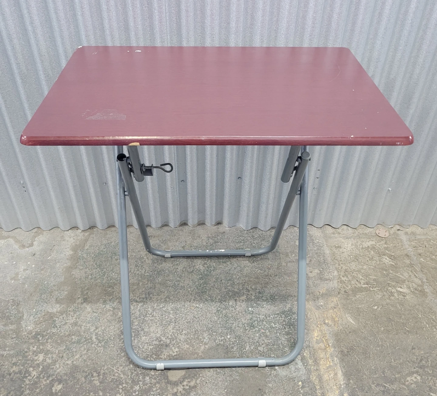 Selling a folding table with a maroon top and gray metal legs. It's easy to store when not in use. Great for small spaces or temporary setups