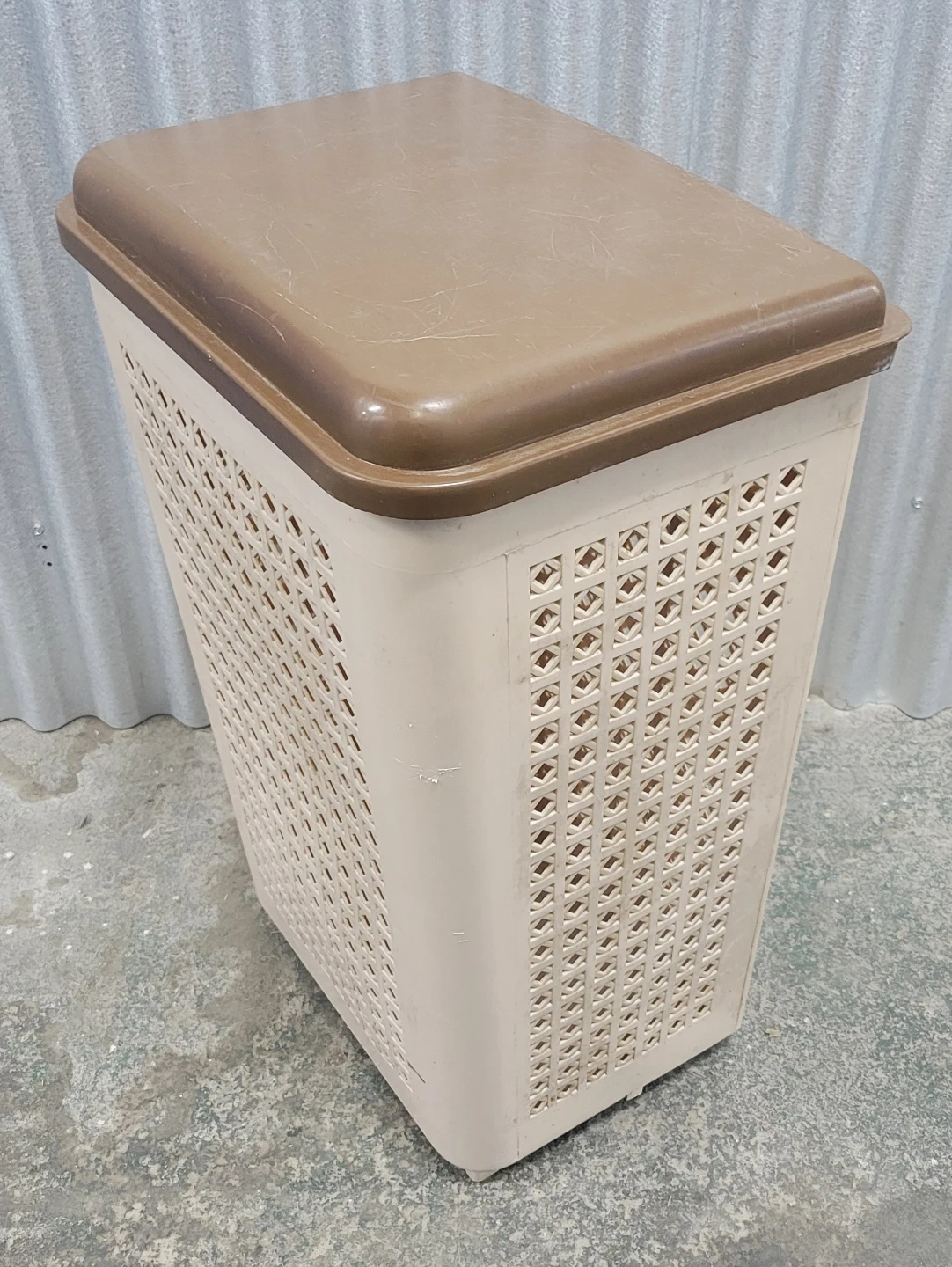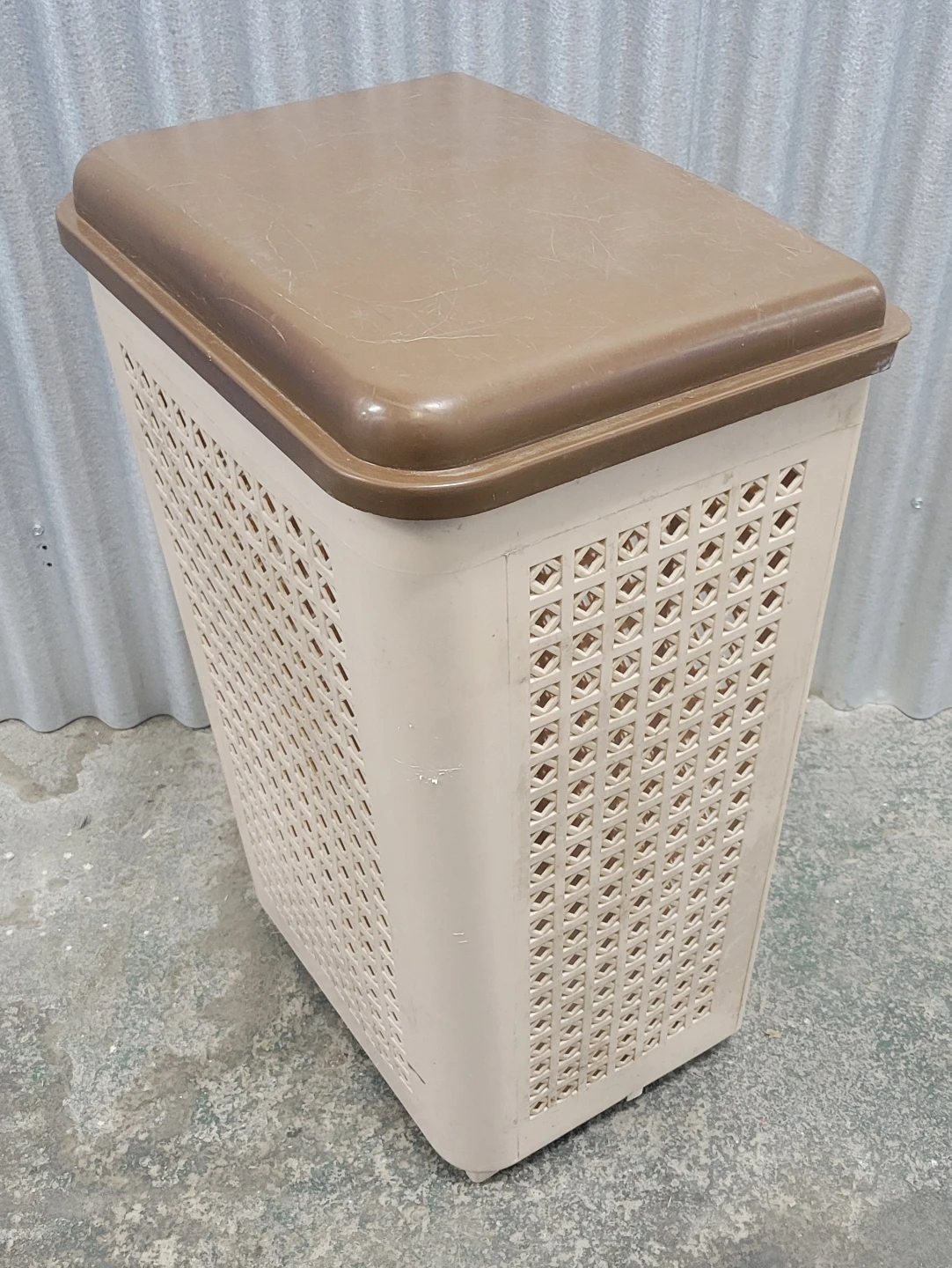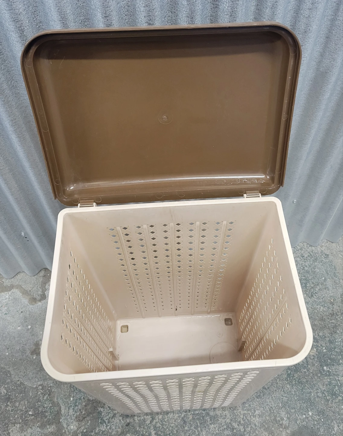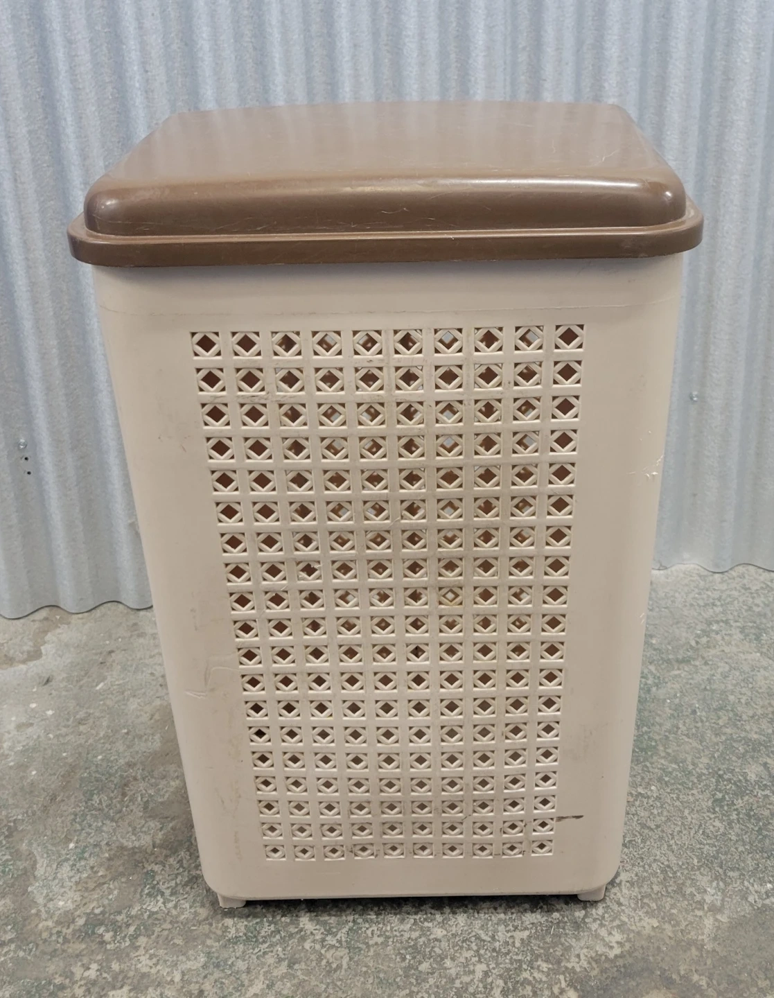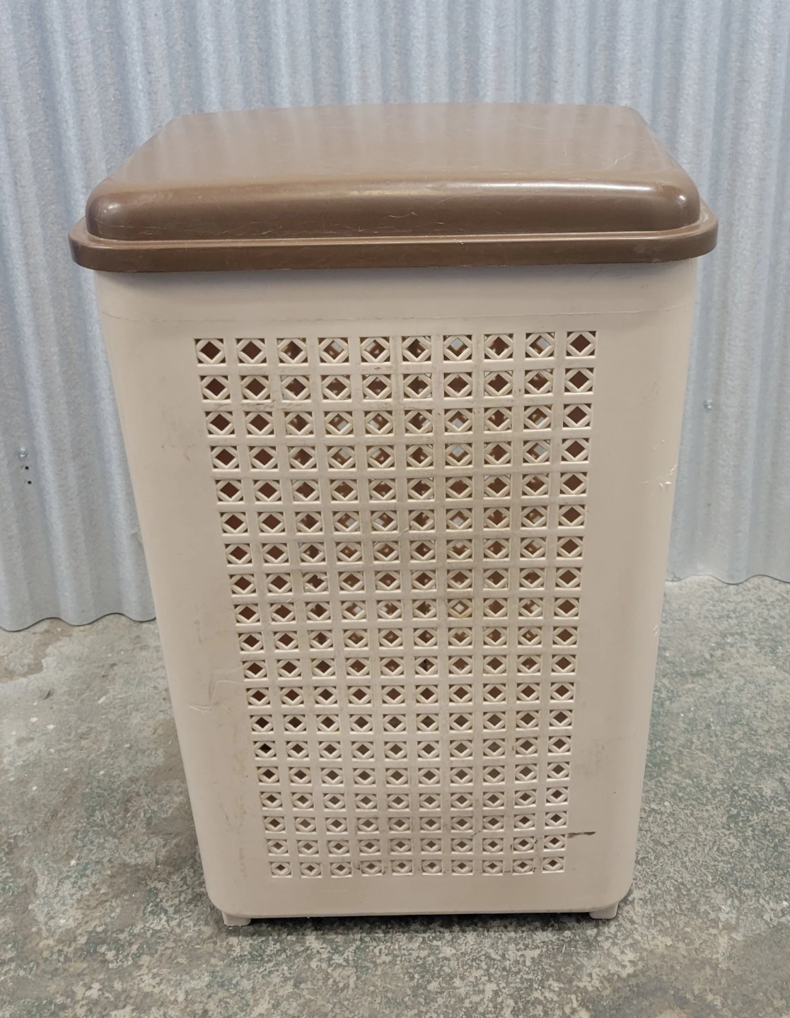 Selling a brown and beige plastic laundry basket. It comes with a lid and is in good condition. Perfect for keeping your laundry organized!