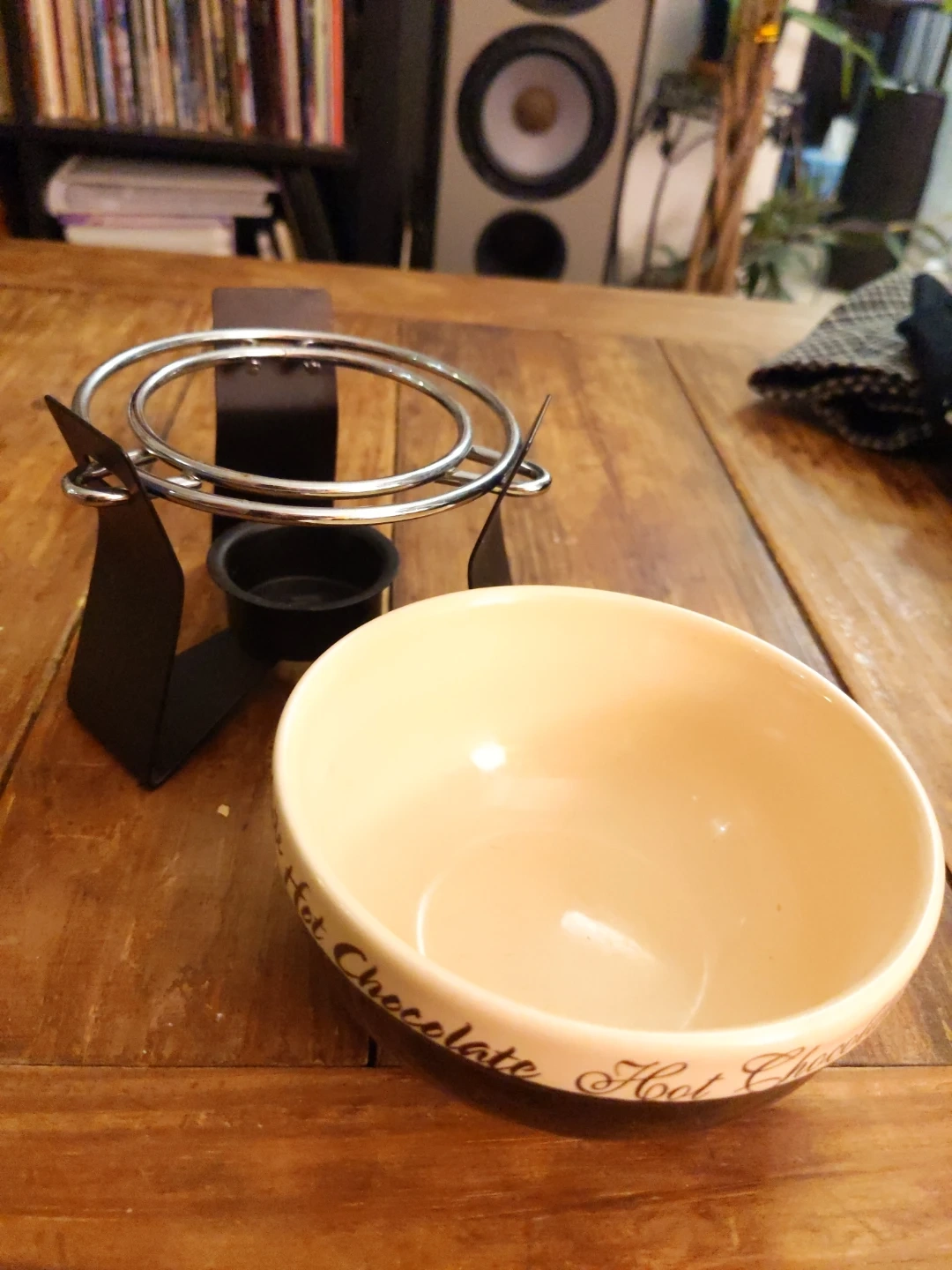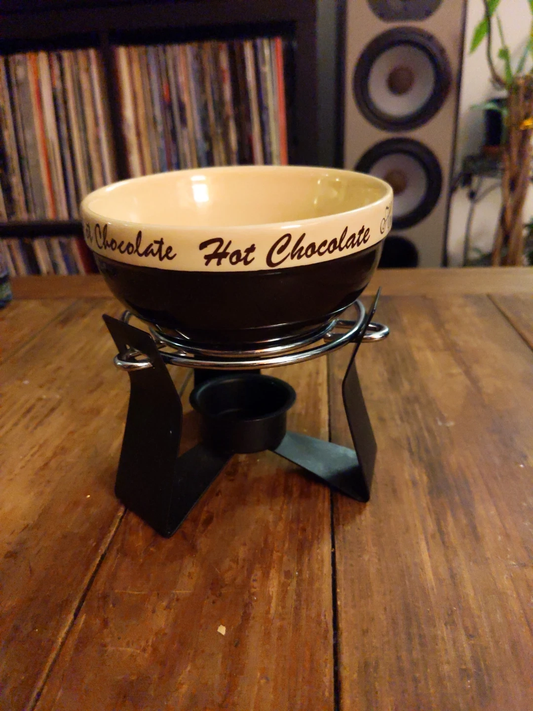 Get ready for some cozy nights with this chocolate fondue set! It features a ceramic bowl with "Chocolate Hot Chocolate" written around the rim, a metal stand, and a tea light holder. Perfect for melting chocolate and enjoying a sweet treat with friends and family