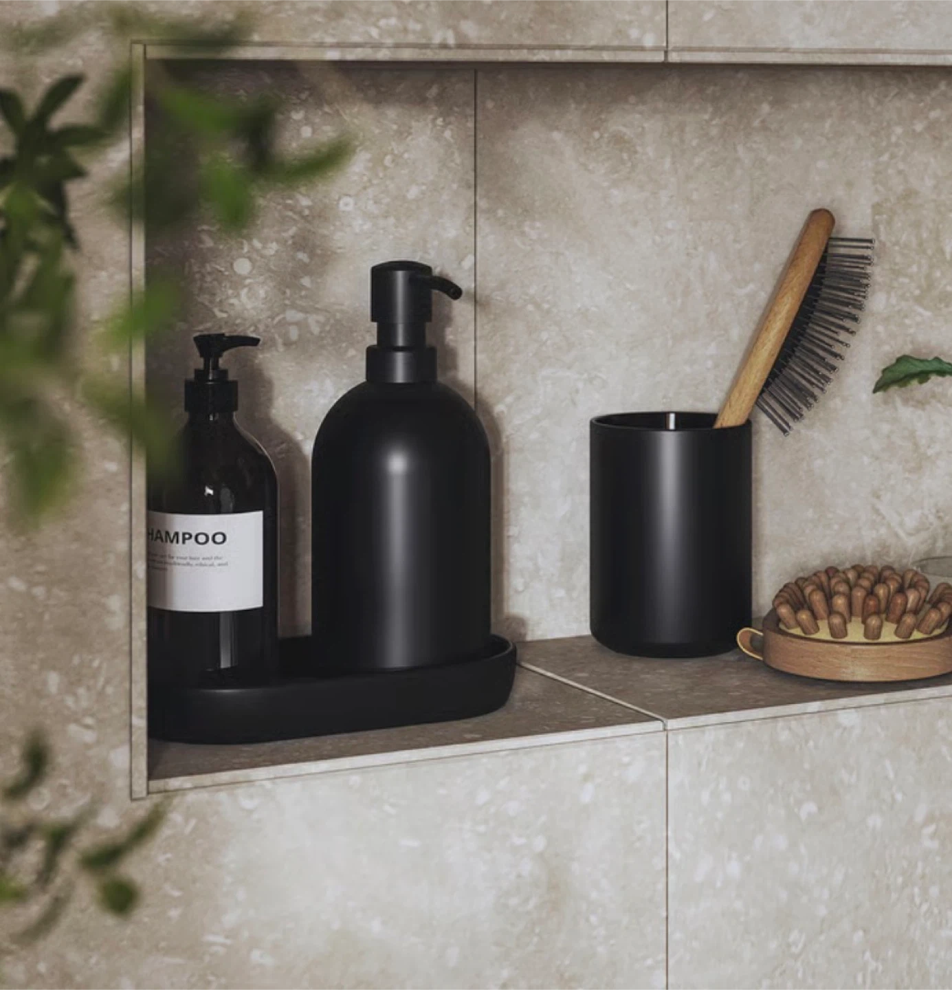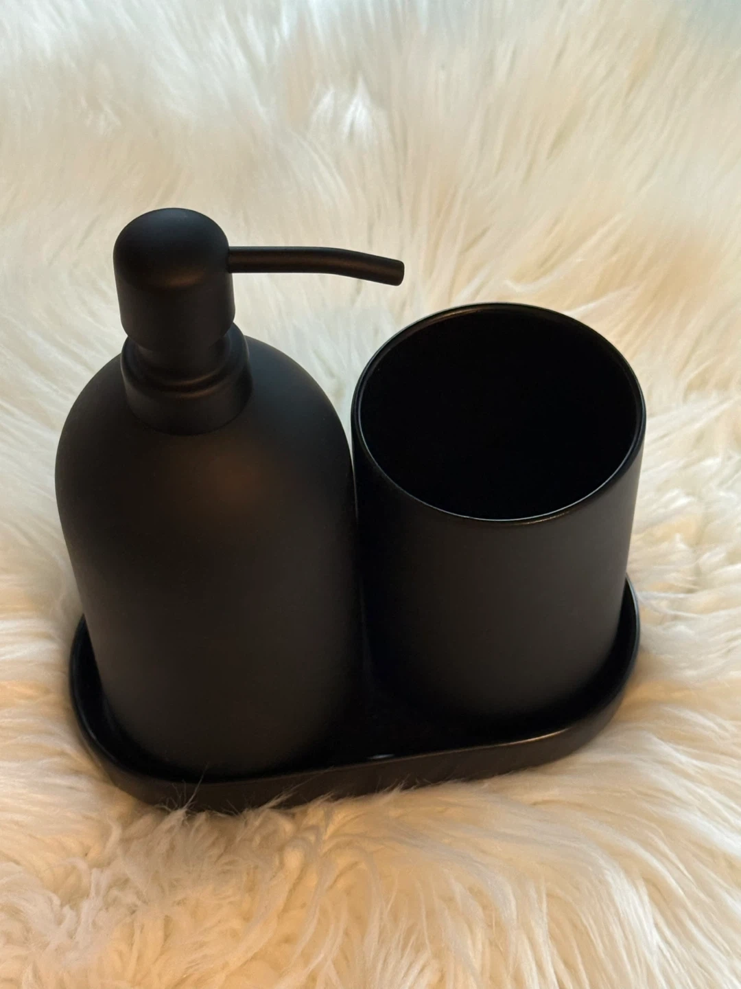 It includes a soap dispenser, a toothbrush holder, and a tray.