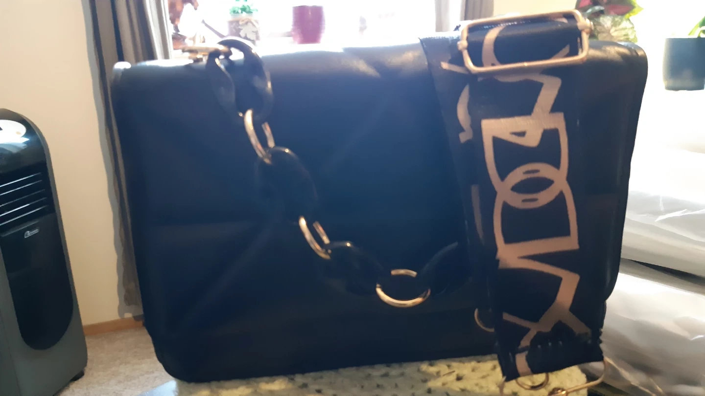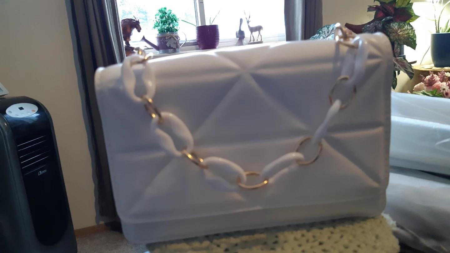 Small purse. Hand strap or adjustable shoulder strap. Brand new. White or black. 8" wide 6" tall. Comes with matching removeable zippered pouch.