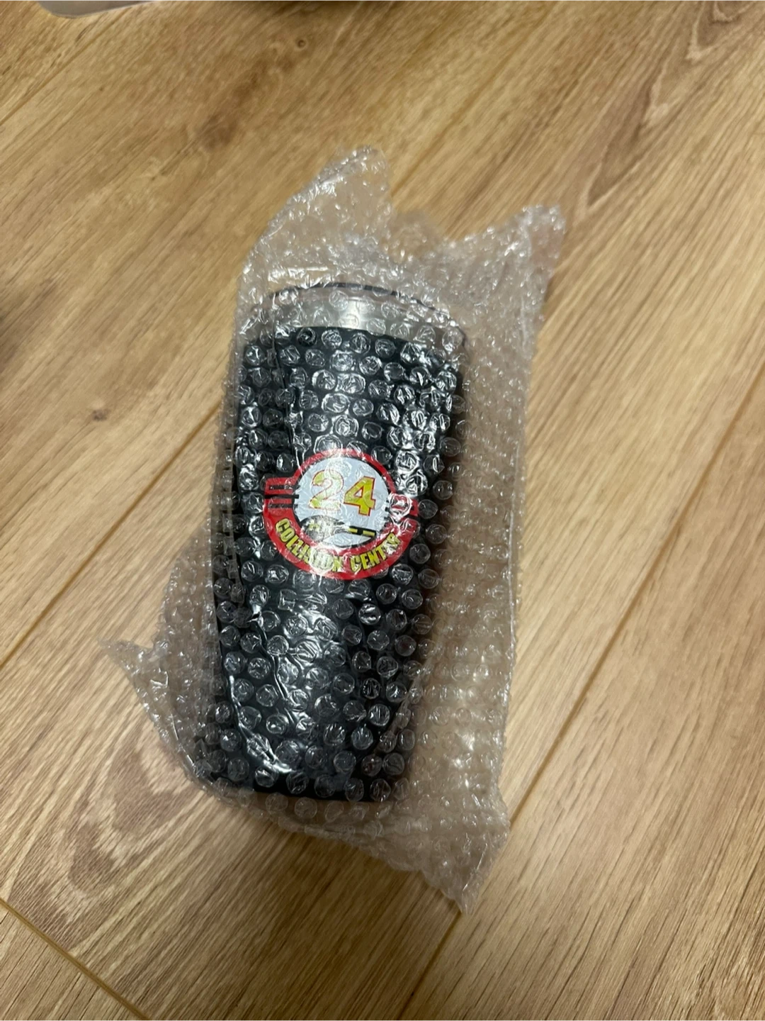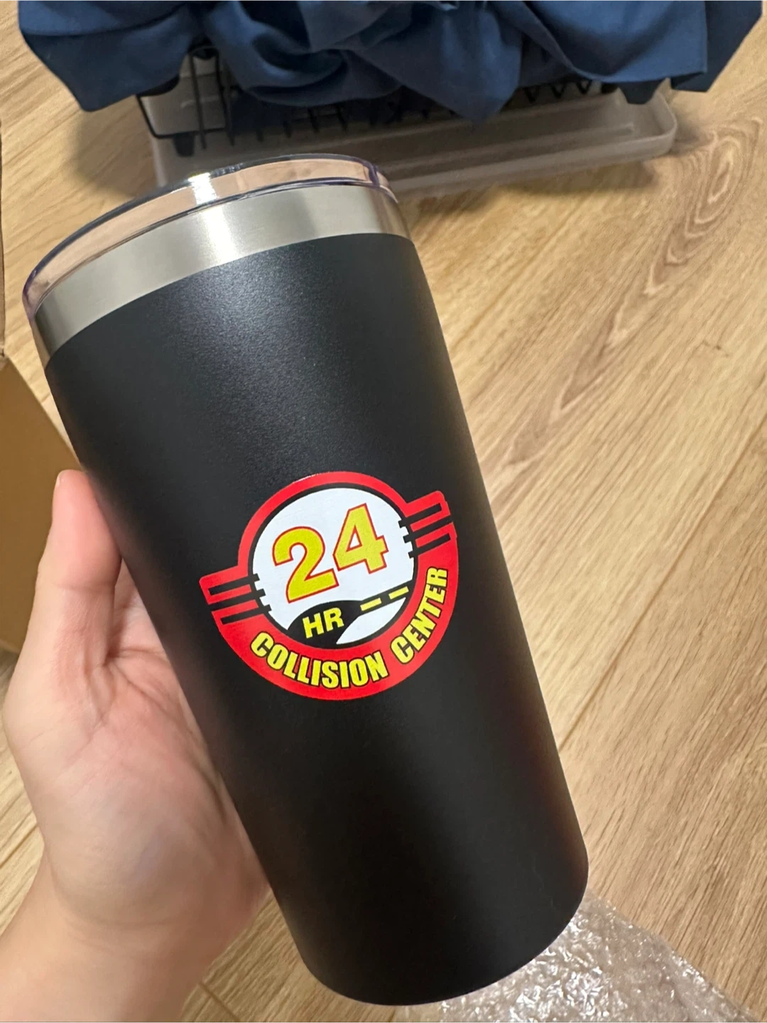 Here's a black tumbler with a logo for 24 HR Collision Center. It's in great condition and ready to keep your drinks at the perfect temperature!