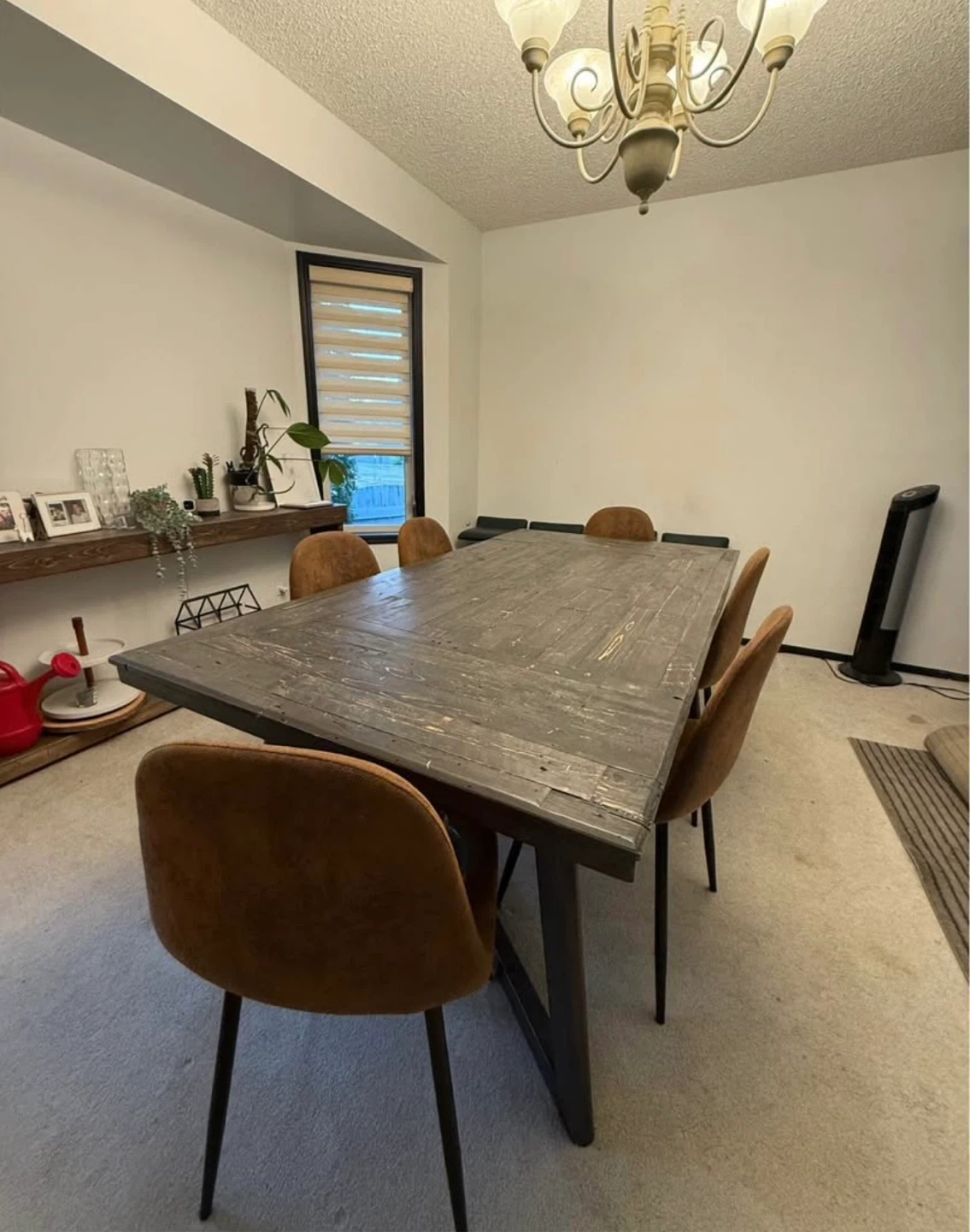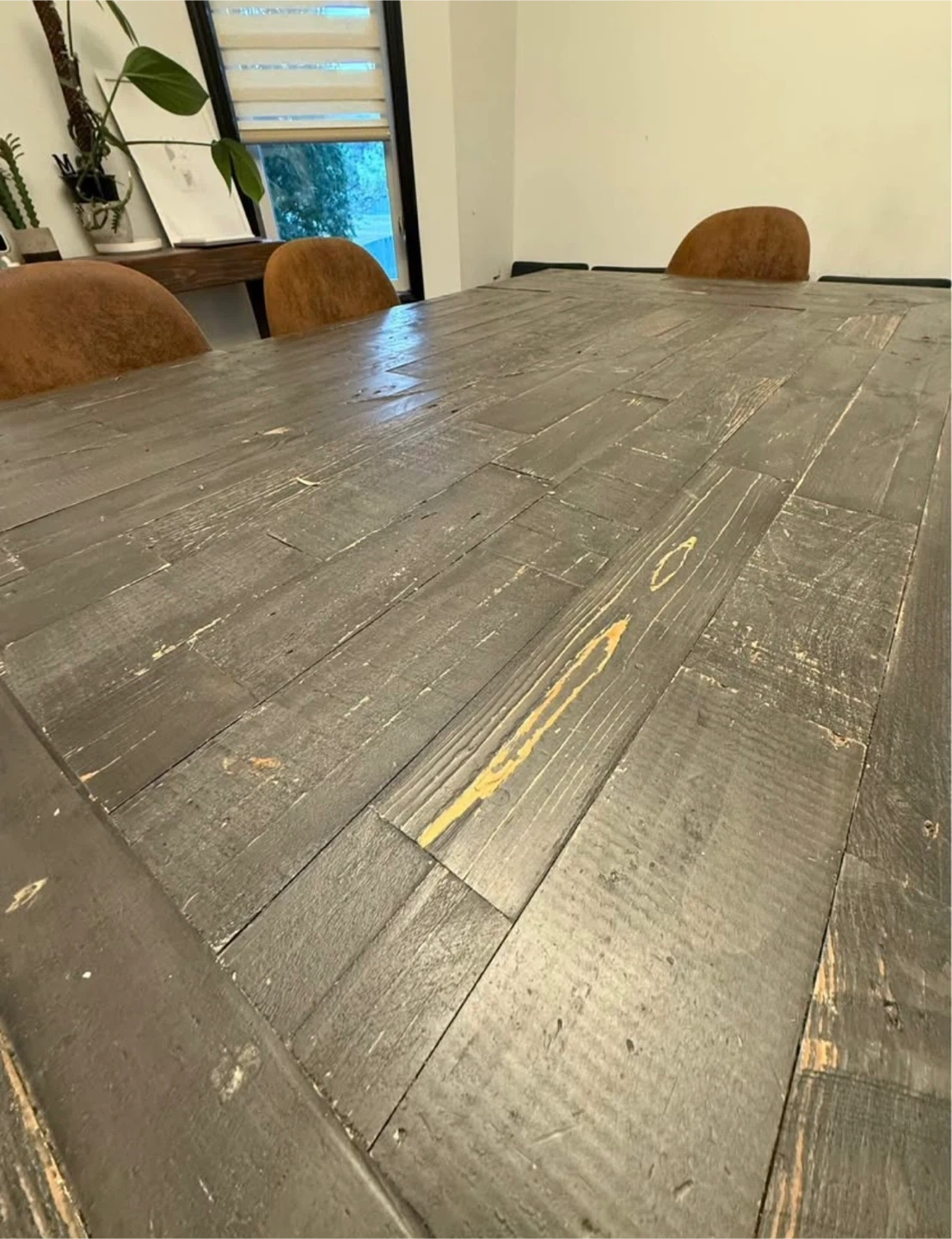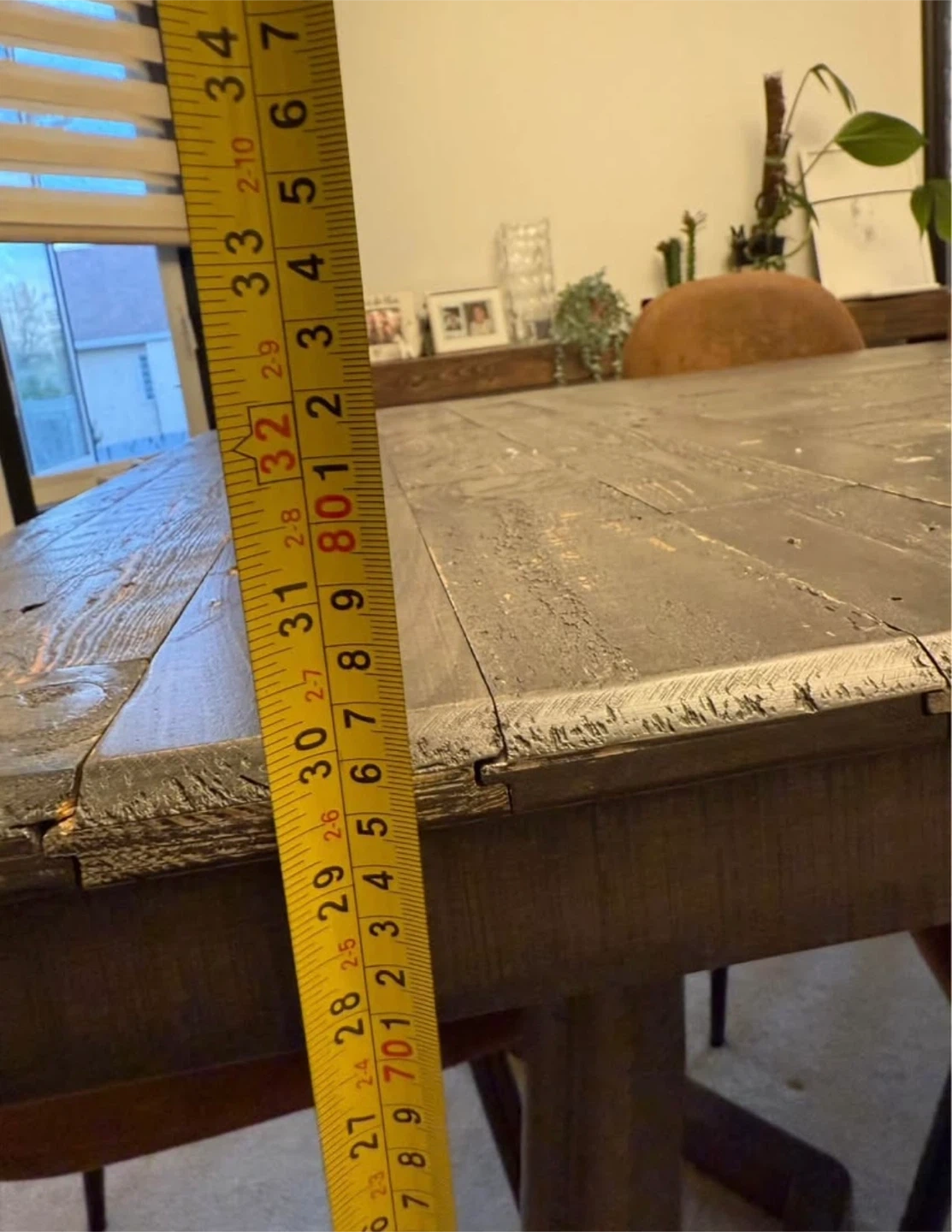 Selling a rustic wooden dining table! It's a great size for family dinners or gatherings. The table shows some signs of wear, which adds to its character. It measures approximately 30" high, 76" length, 40" wide.