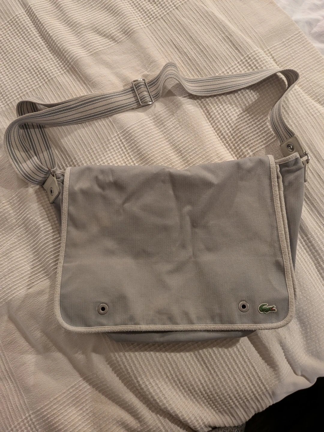 Selling a Lacoste messenger bag in a lovely grey colour! It's in great shape and ready for a new owner. Perfect for carrying your essentials around town. Approximately 12 x 16 x 5.5 inches.