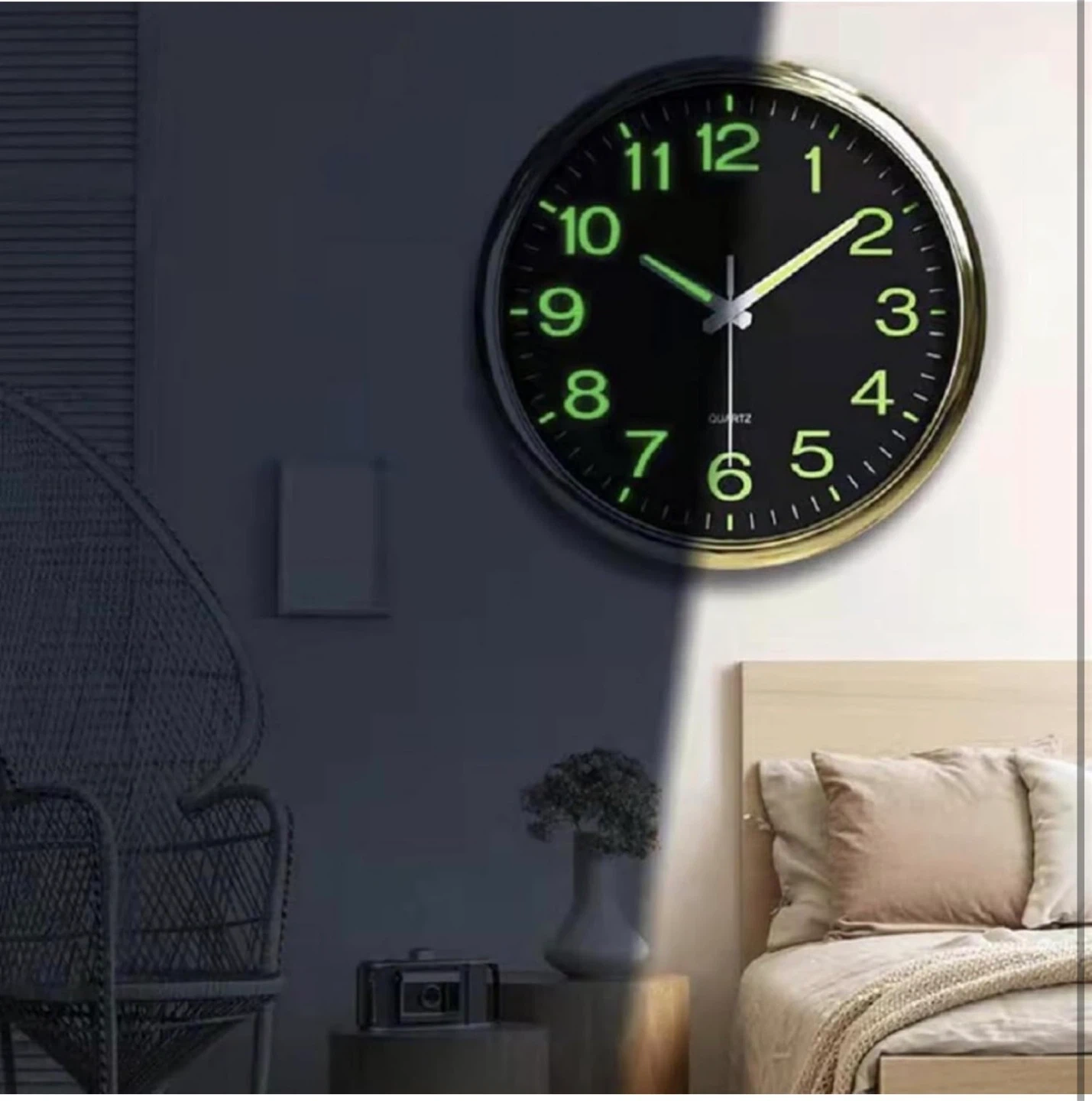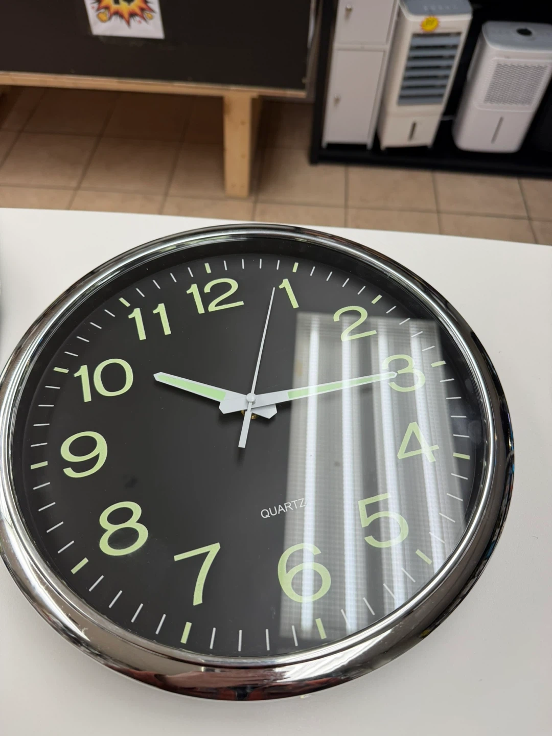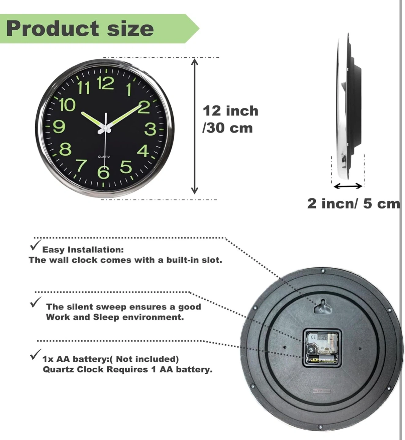 Selling a 12-inch wall clock that glows in the dark! It has a built-in slot for easy installation. The silent sweep ensures a good work and sleep environment. Requires 1 AA battery (not included)