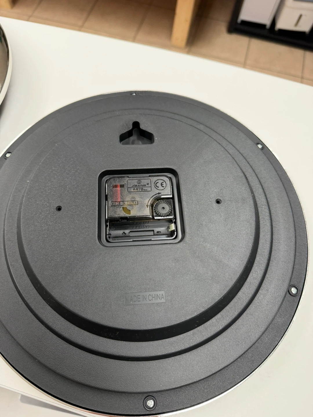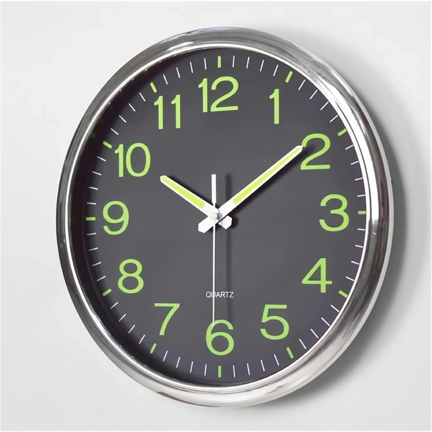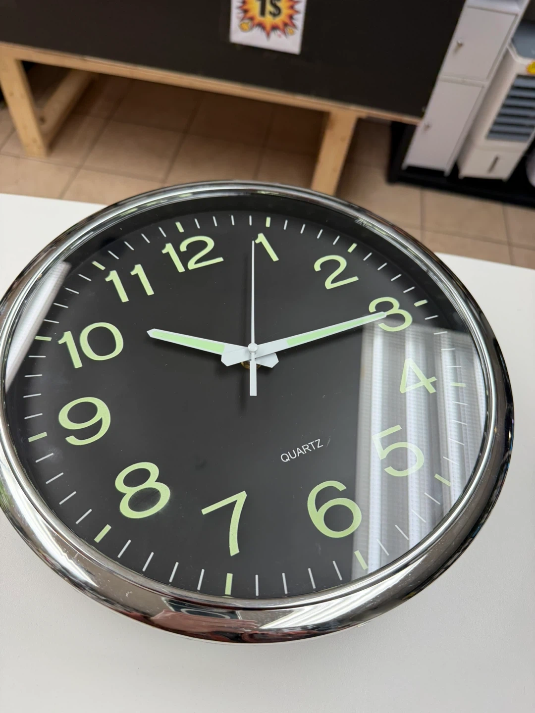 Selling a 12-inch wall clock that glows in the dark! It has a built-in slot for easy installation. The silent sweep ensures a good work and sleep environment. Requires 1 AA battery (not included)