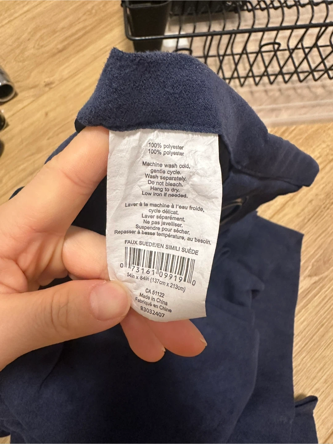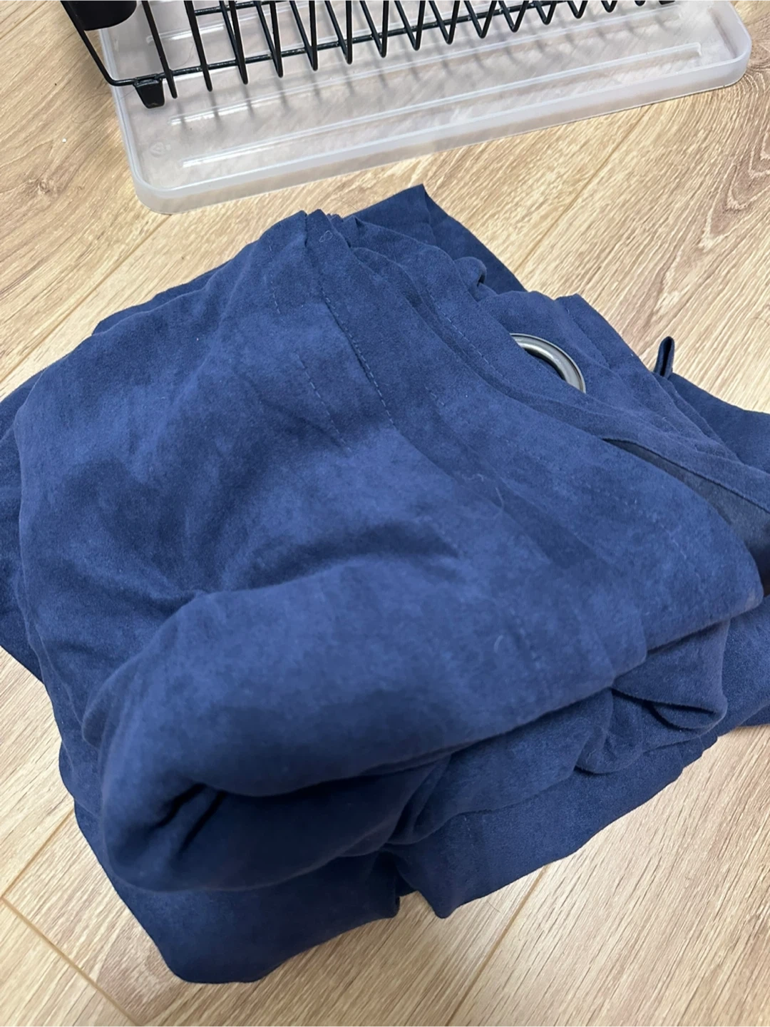 These navy blue curtains are made of 100% polyester faux suede. They measure 54 inches by 84 inches (137cm x 213cm). They're in great shape and ready to hang!