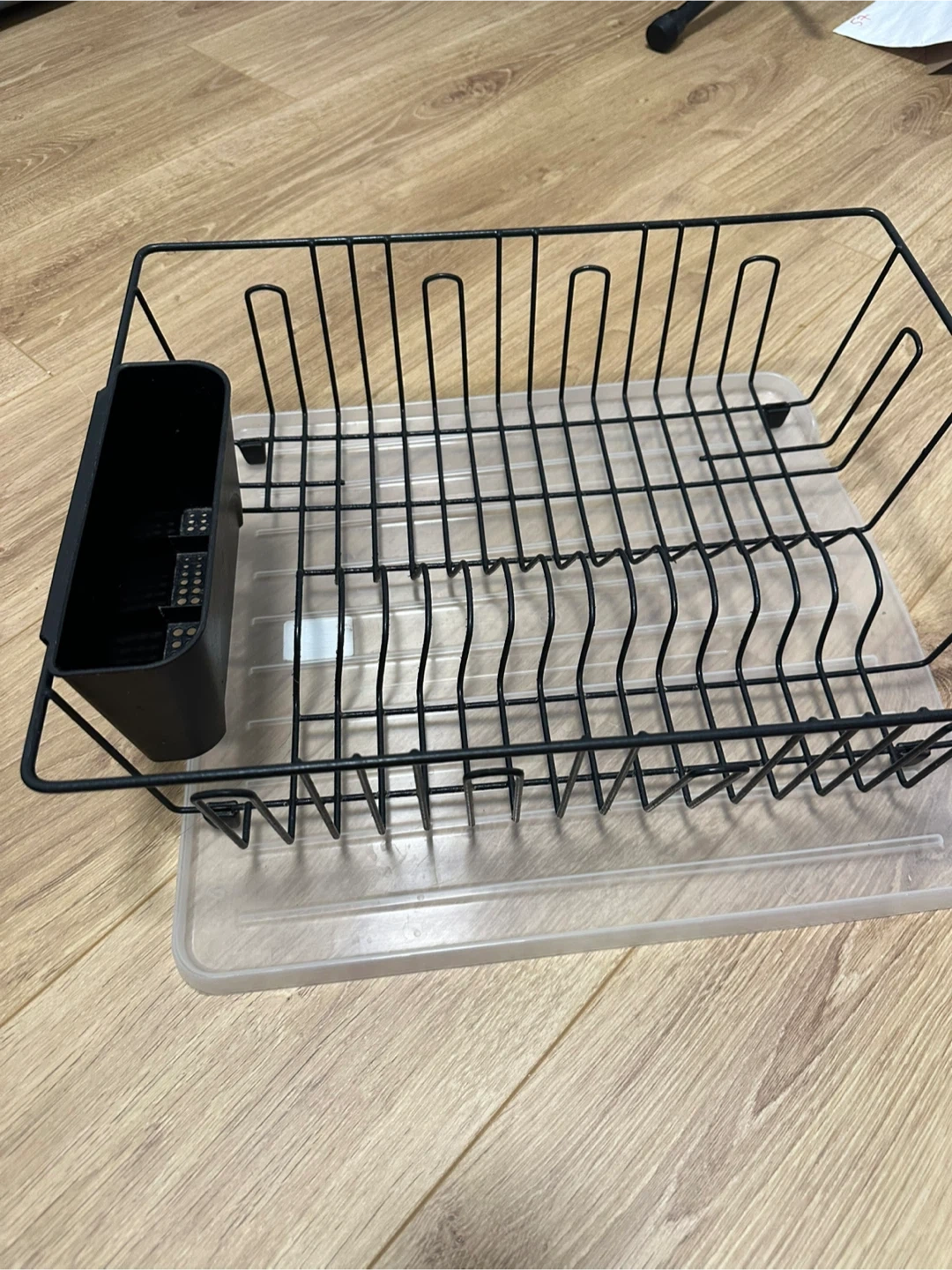 Here's a black dish drying rack! It comes with a utensil holder and a clear plastic tray to catch water. Great for keeping your dishes organized after washing!