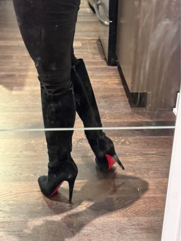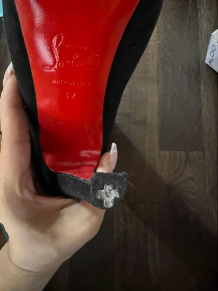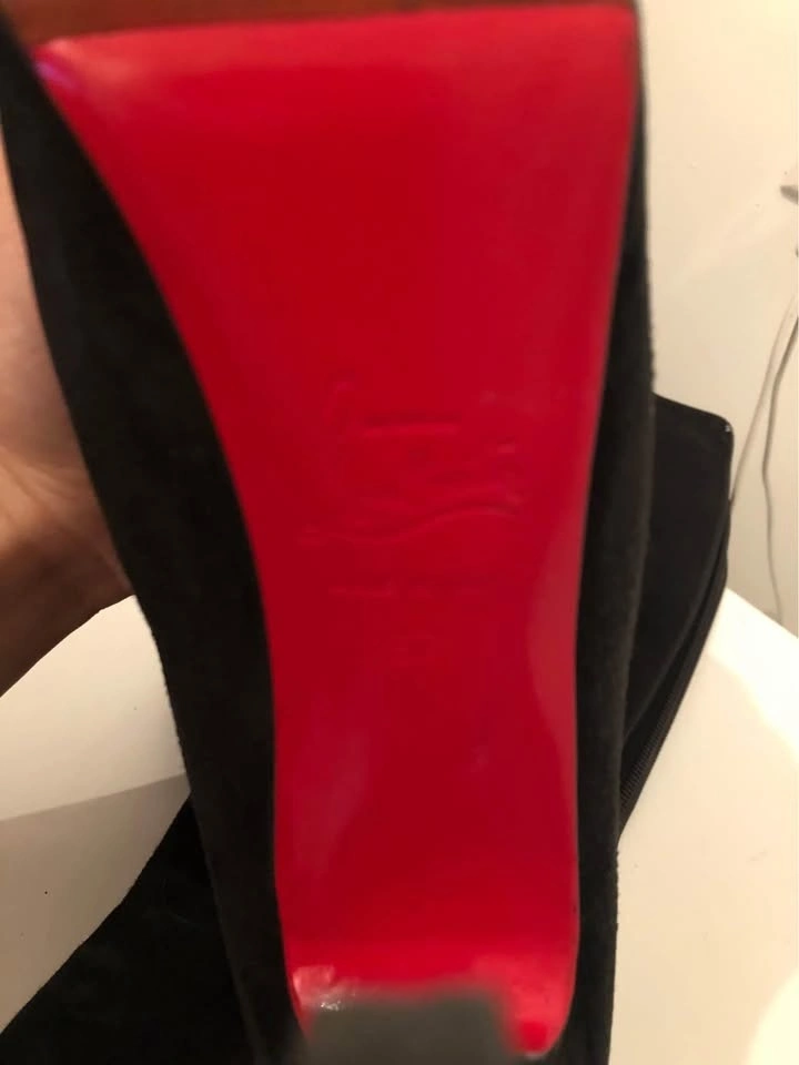 Perfect for skirt season with boots. Sits just under your knees. Size 37. Well used, no box. Prestine interior, no smell. Both heels are worn, you will have to get them repaired. Red sole protector on since day 1. It’ll be like new once you have heels repaired.
