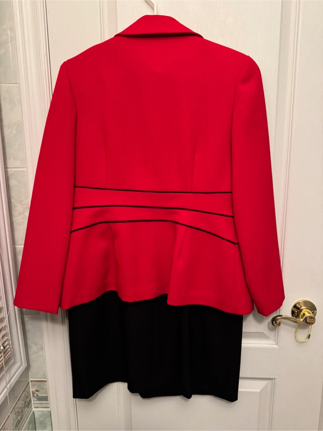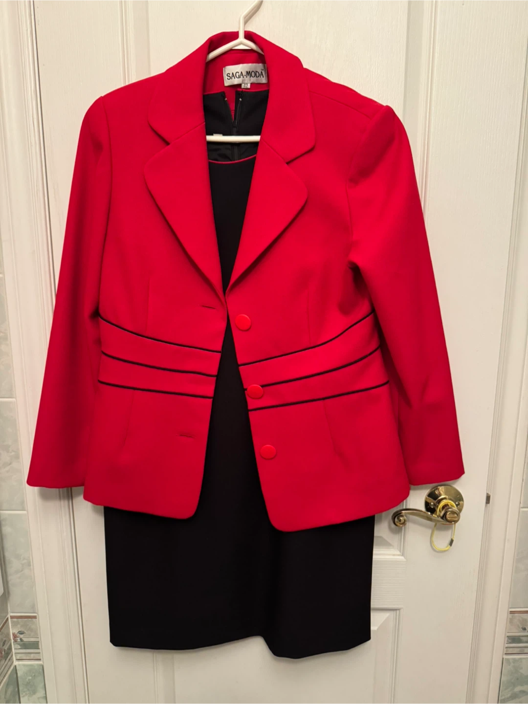 Selling a Saga Moda two-piece set! It includes a vibrant red blazer and a classic black dress. Perfect for a professional or formal occasion. The blazer adds a pop of colour, while the dress is a timeless staple. Never worn!
