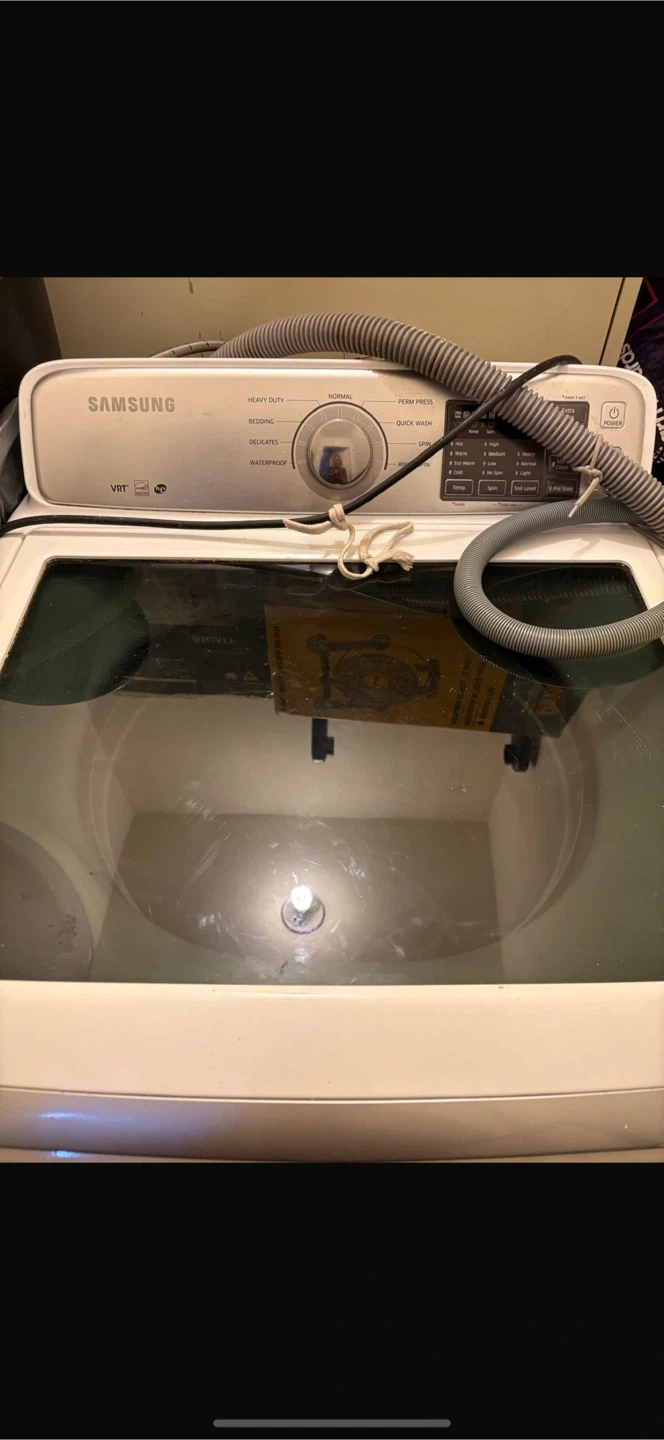 Selling a Samsung top-load washing machine. It has settings for heavy duty, bedding, delicates, waterproof, normal, perm press, quick wash, and more!