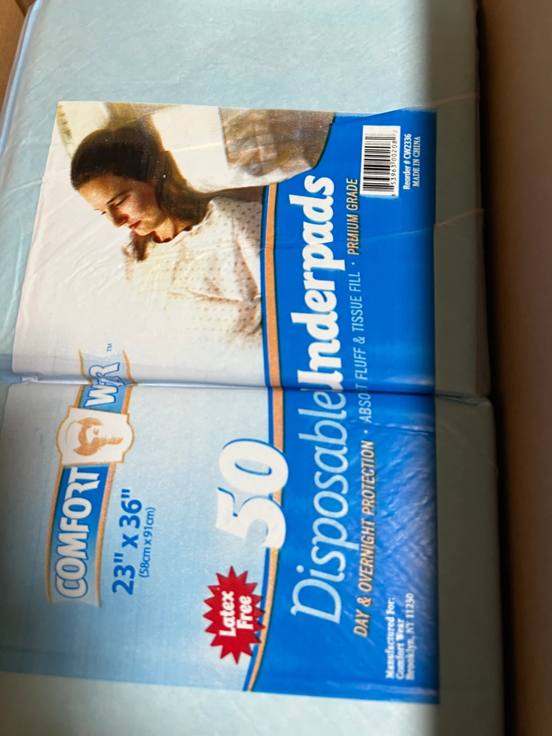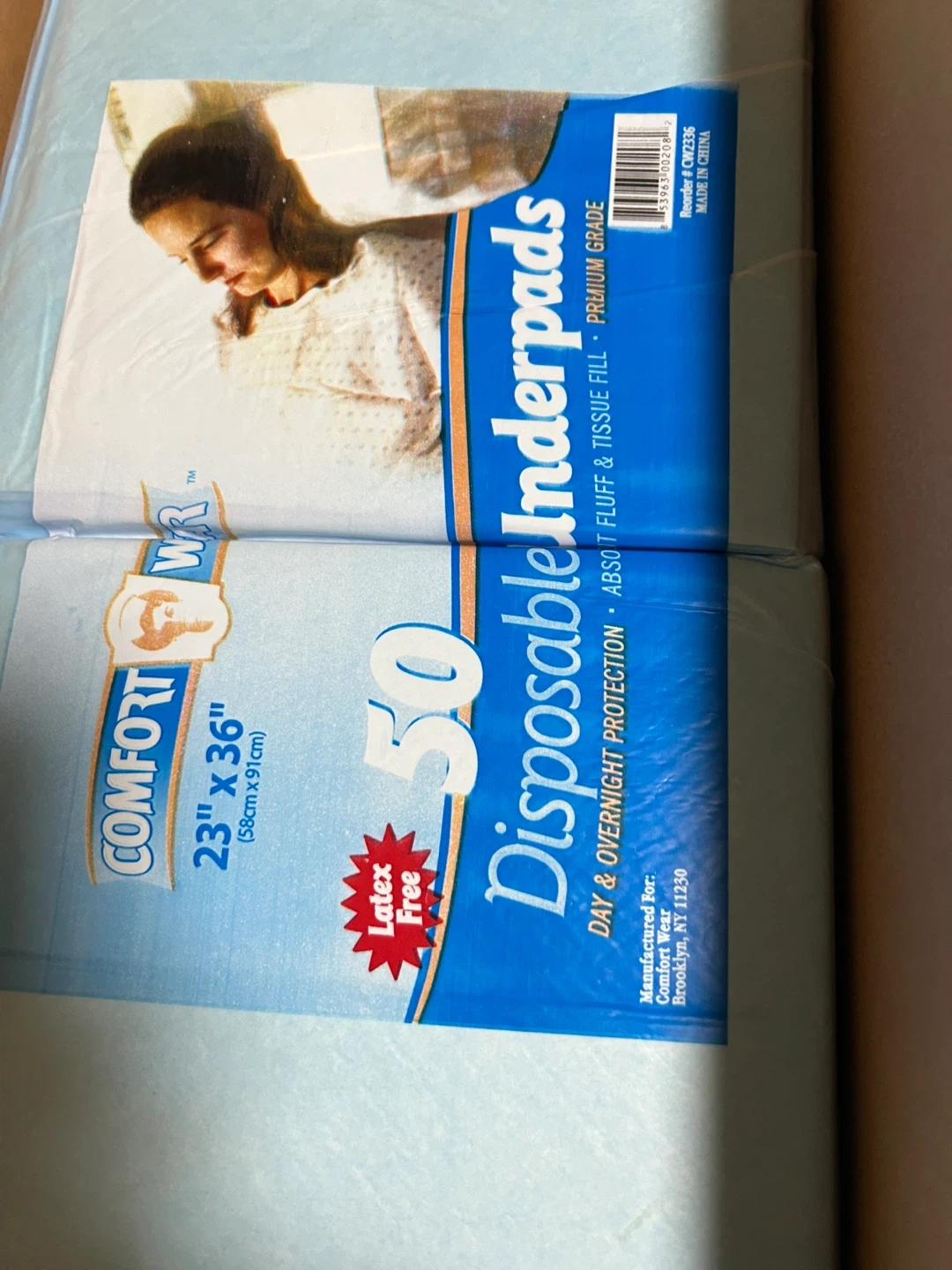Selling Comfort Wear Disposable Underpads. Each pad measures 23" x 36" (58cm x 91cm). There are 50 pads in each pack. These underpads offer day and overnight protection with absorbent fluff and tissue fill. They are latex free