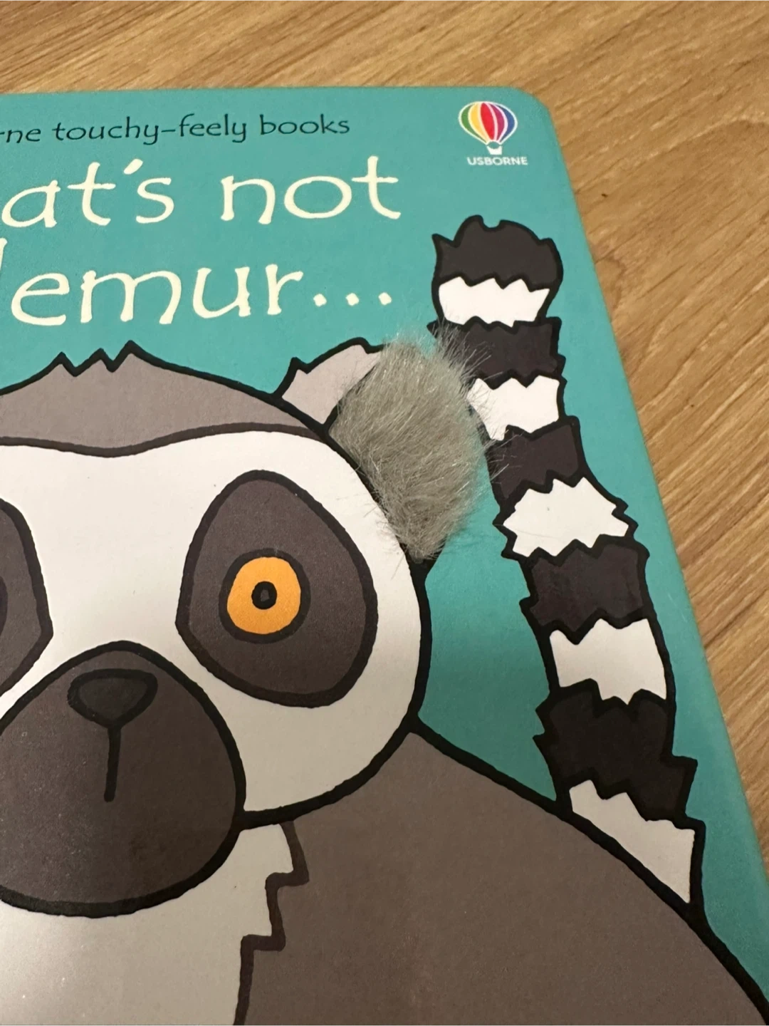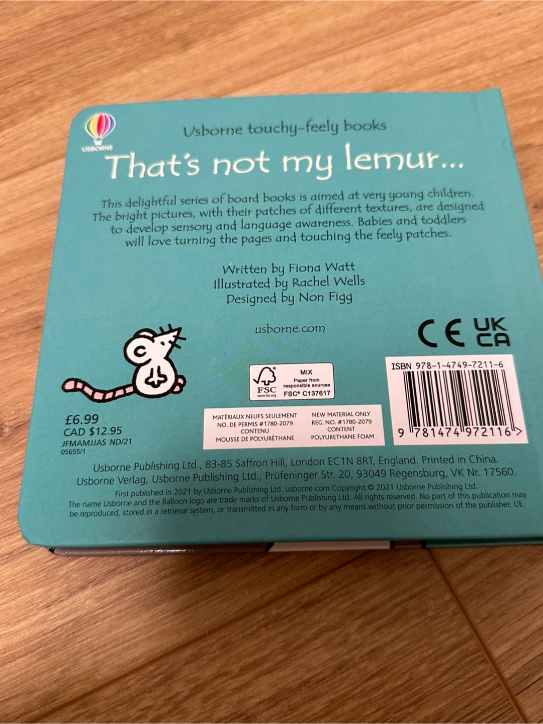 Selling a gently used Usborne touchy-feely book, "That's not my lemur". This delightful series of board books is aimed at very young children. The bright pictures, with their patches of different textures, are designed to develop sensory and language awareness. Babies and toddlers will love turning the pages and touching the feely patches