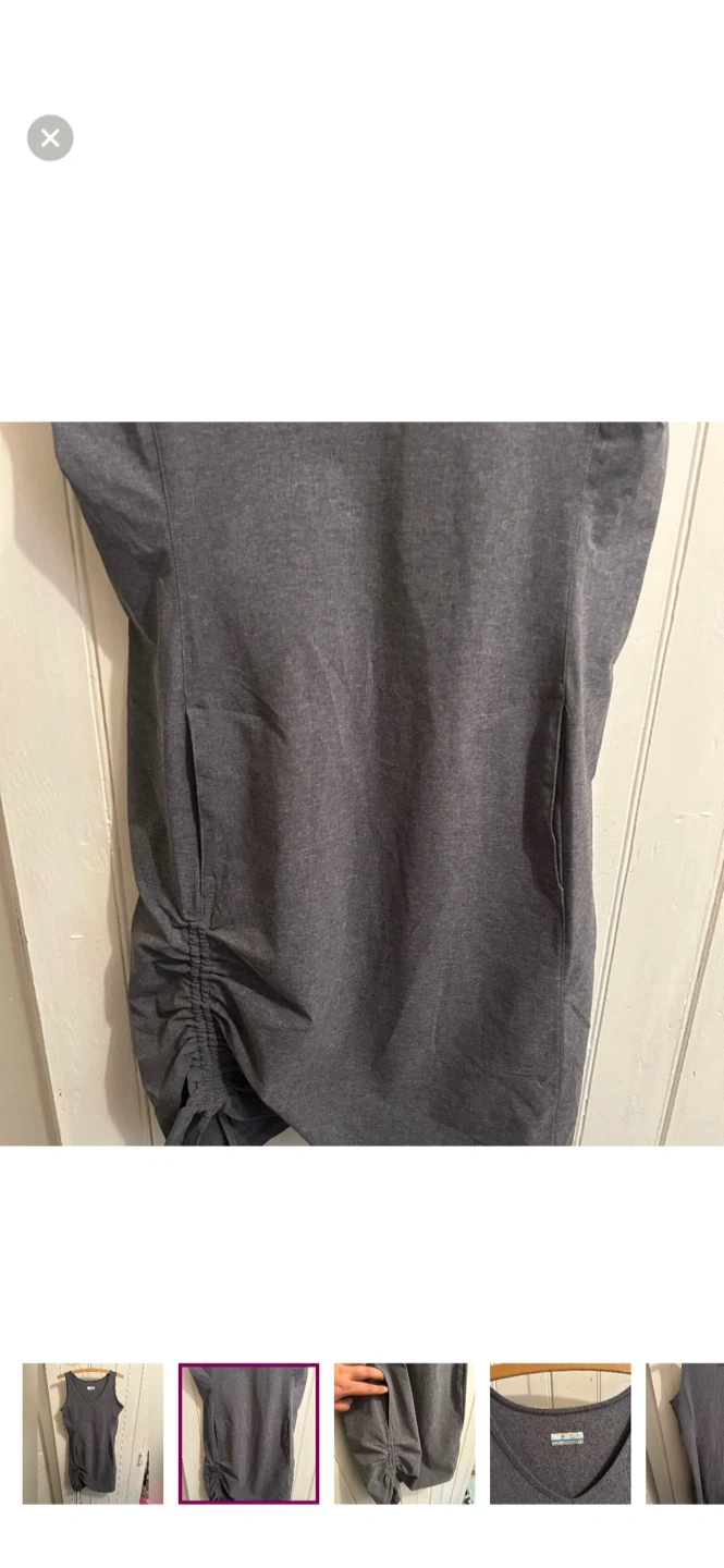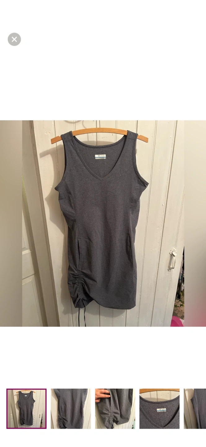 Columbia brand. Sleeveless vneck dress with adjustable side scrunch. Two front pockets. Grey in colour. Size small. Brand new condition