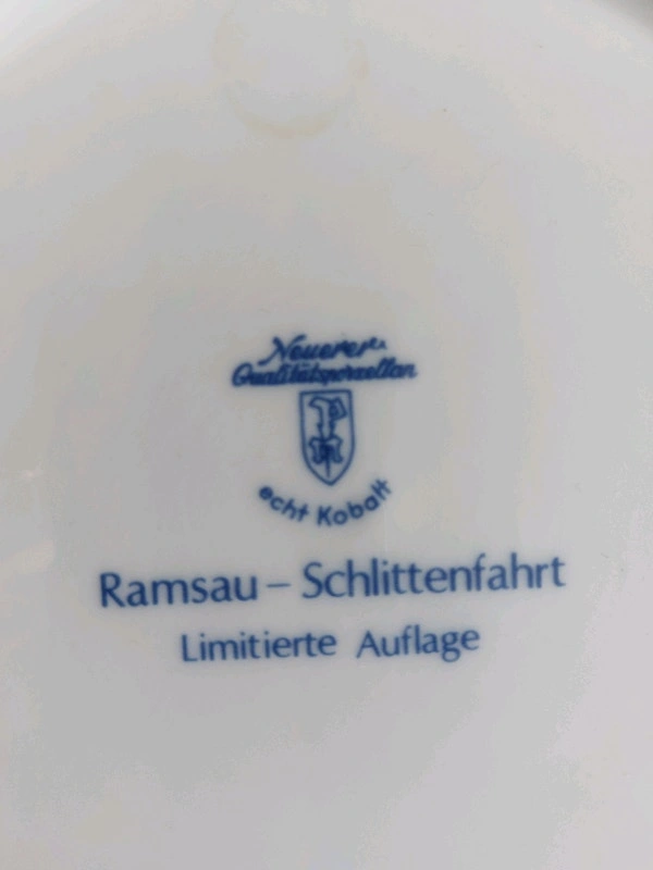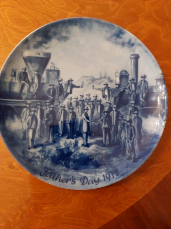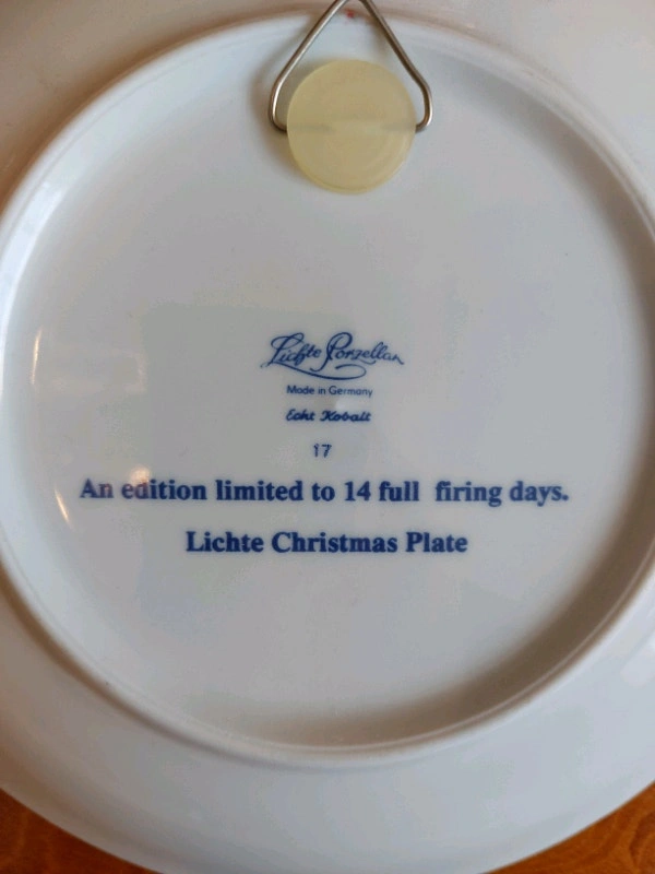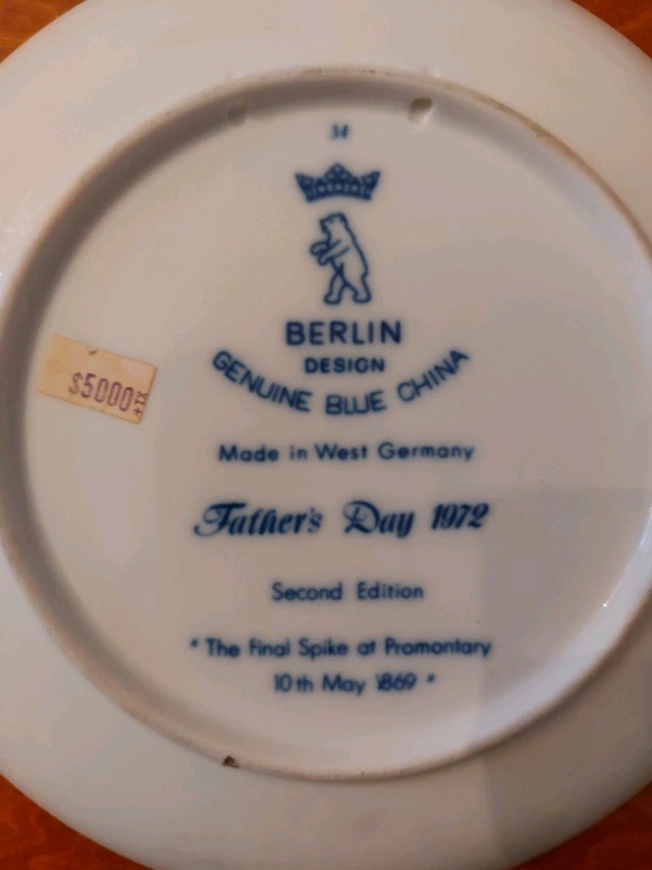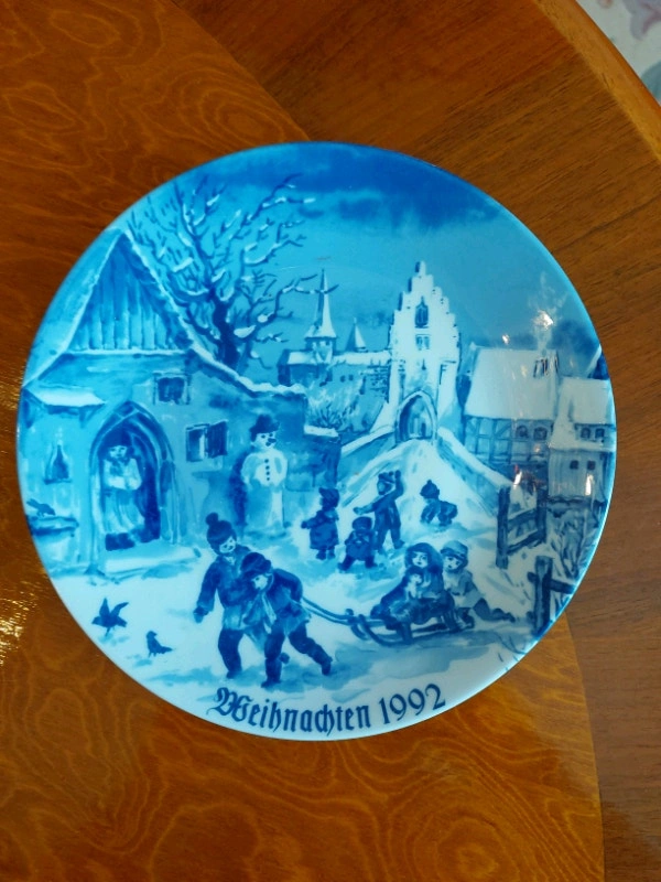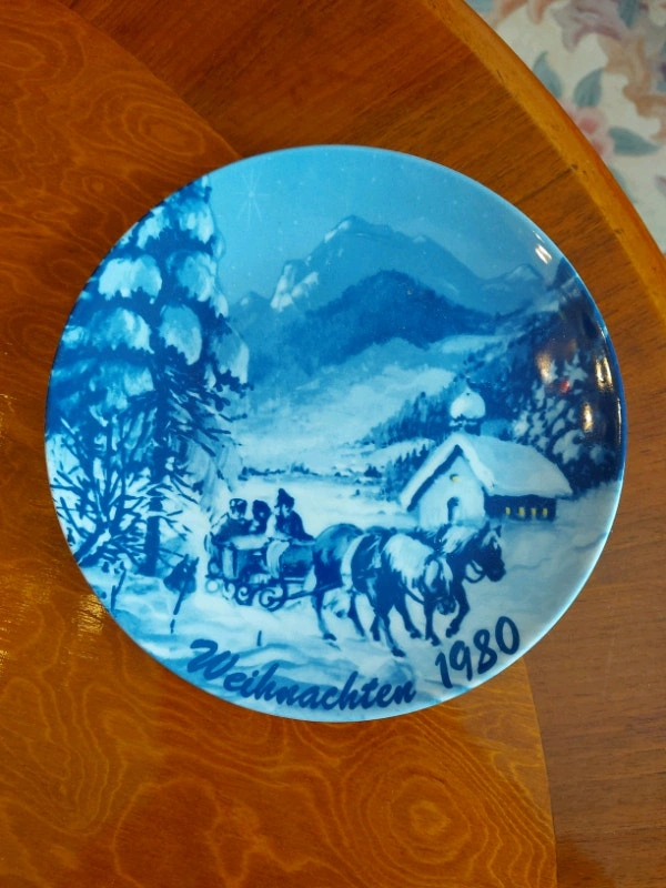 Three Genune Blue China, German decorative plates. Perfect condition, evoke feelings of yesteryear, Weihnachten 1980 and 1992. Father's Day 1972 (The final spike at Promontary, 10th May 1869) Made in West Germany. Vase from Singapore. Small flower pot. Decorative, hexagonal, hand-built jar with matching lid (very difficult to get a white glaze). Large enamel pitcher (handle has missing enamel spot). Decorate with style! These colors are always in fashion.