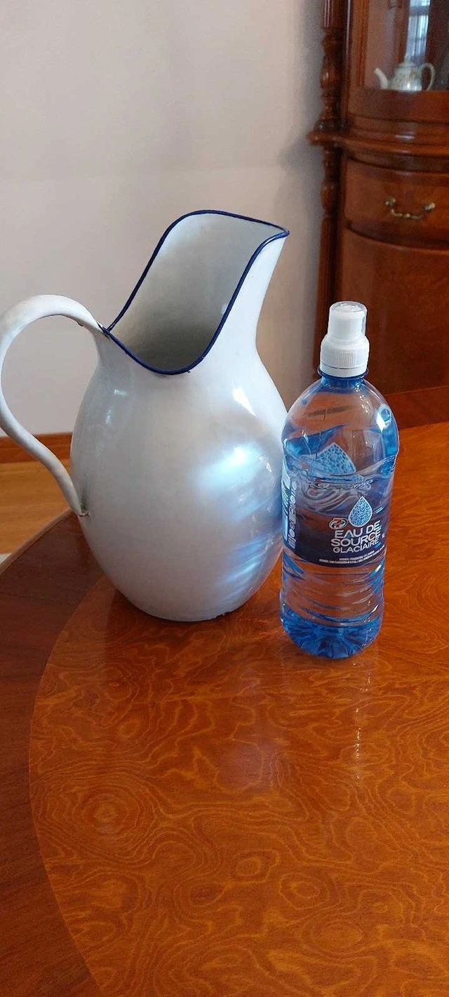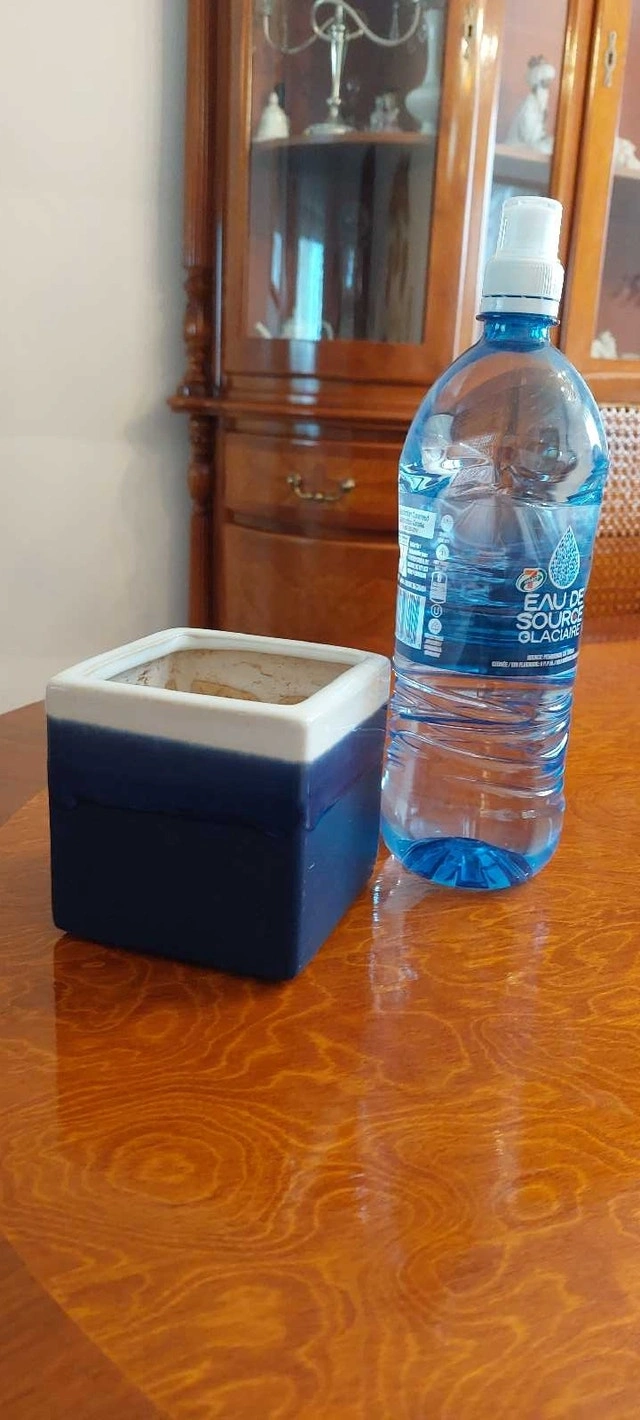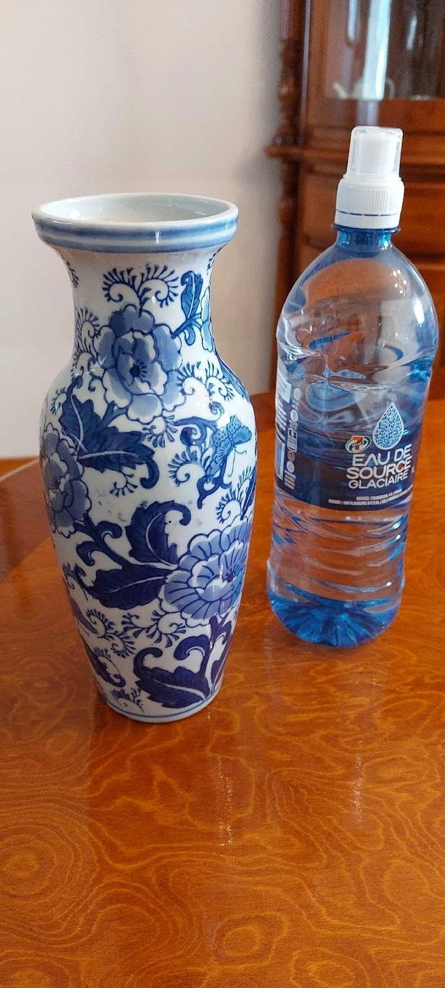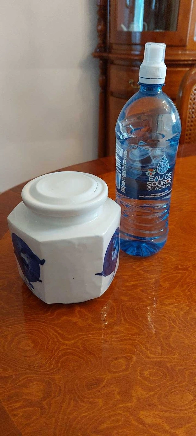 Three Genune Blue China, German decorative plates. Perfect condition, evoke feelings of yesteryear, Weihnachten 1980 and 1992. Father's Day 1972 (The final spike at Promontary, 10th May 1869) Made in West Germany. Vase from Singapore. Small flower pot. Decorative, hexagonal, hand-built jar with matching lid (very difficult to get a white glaze). Large enamel pitcher (handle has missing enamel spot). Decorate with style! These colors are always in fashion.