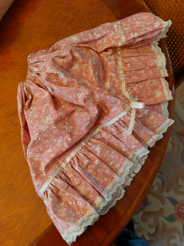 Salmon-colored shower curtain and matching liner, matching soap dish, matching shower curtain rings, matching lamp shade ( for any room), small black and gold wastebasket. Like new. Two pairs of rubber gloves, size small (new), Shelf/drawer liner (new)