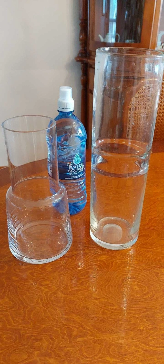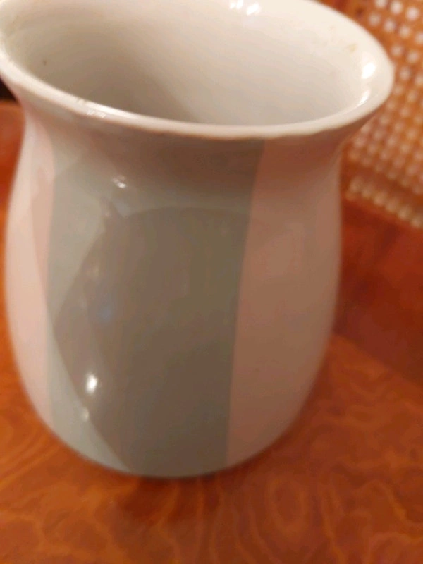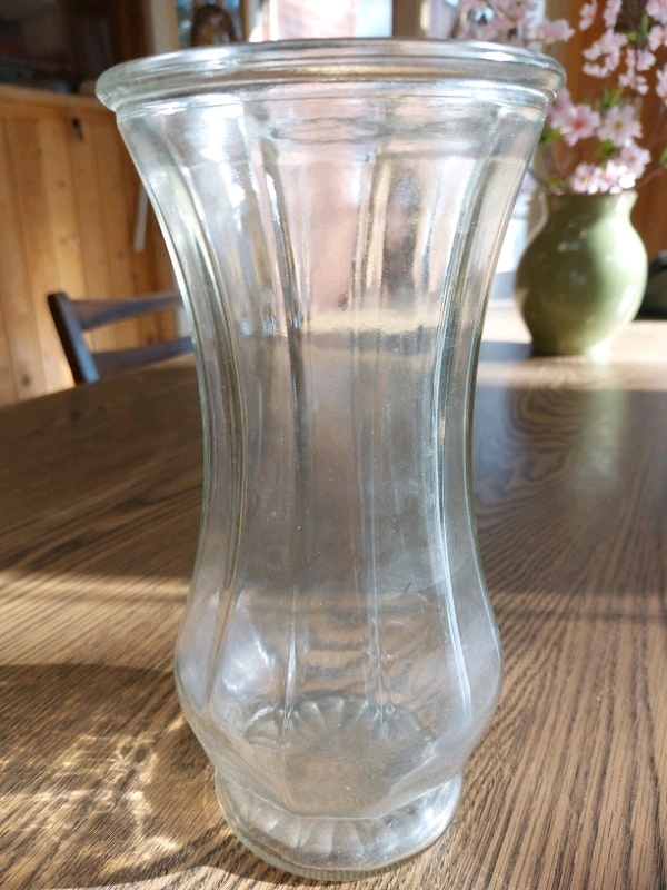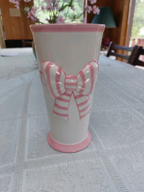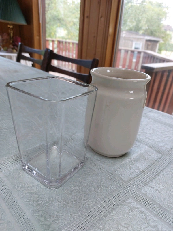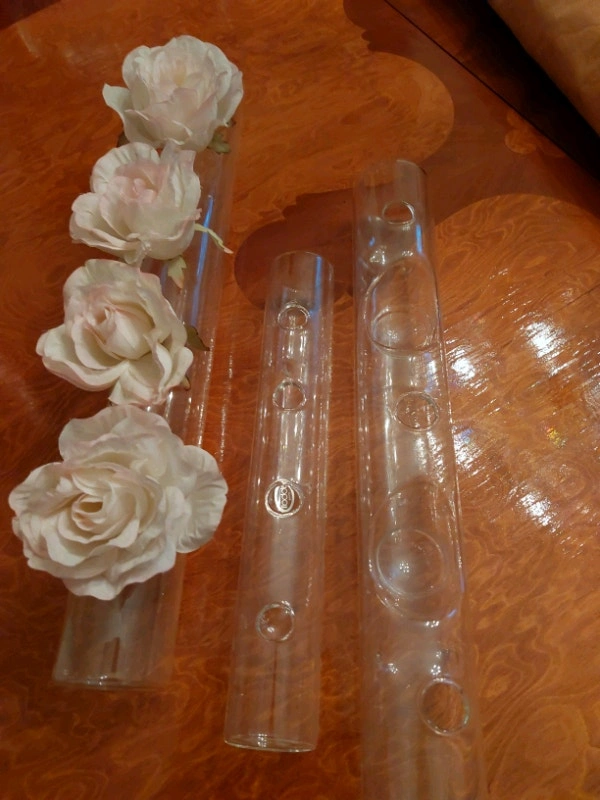 Three long cylinders to permit table conversation...wonderful! Four clear glass for bouquets, one pink and white - perfect for a little girl floral arrangement, one mint green and white stripes...all in excellent condition.