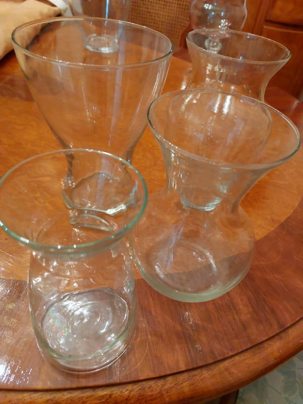For creative, cost-conscious, holiday cheer...arrive with a hostess gift you have made yourself! Nine glass vases, one ceramic bowl - all different sizes and shapes. You gather the pine, spruce, other greenery, some ribbons, and assorted ho, ho, ho holly, jolly knick-knacks, and let your imagination run wild! All in perfect condition.