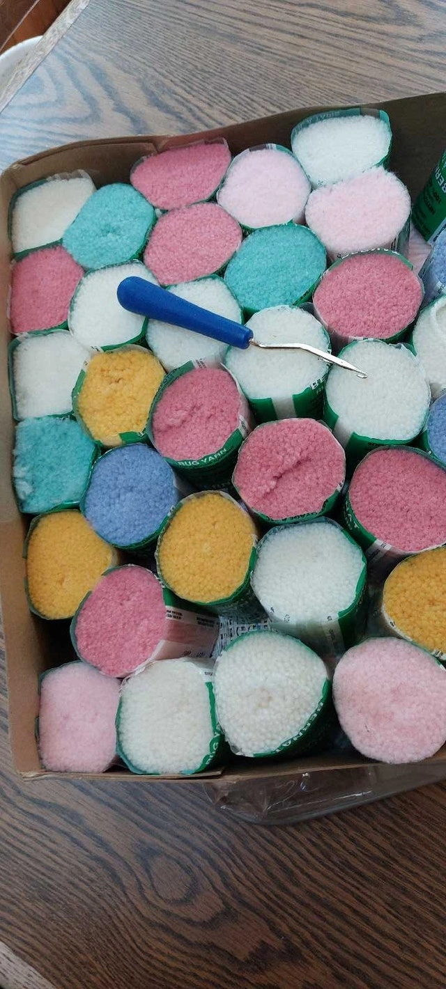 Pastel colored rug, nice for baby's nursery. It has a few stitches done, but otherwise, needs completing. Would be lovely for family project to welcome a new addition. Great price.