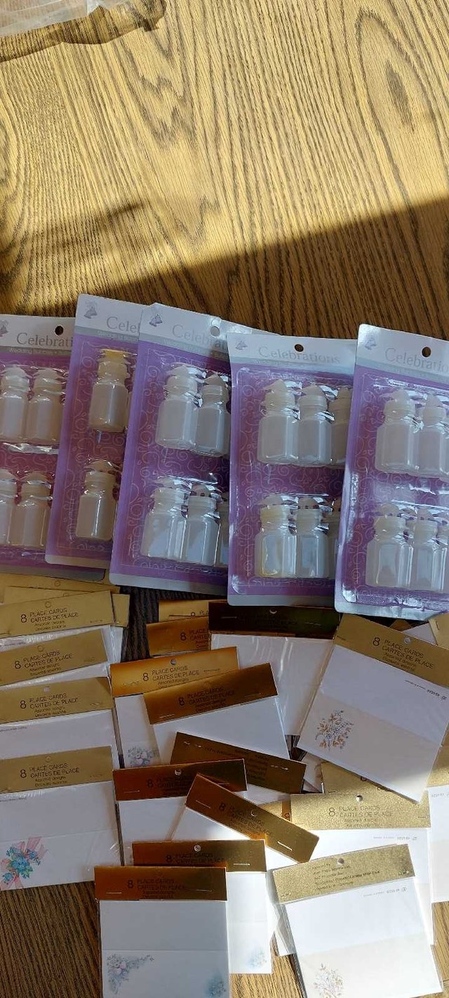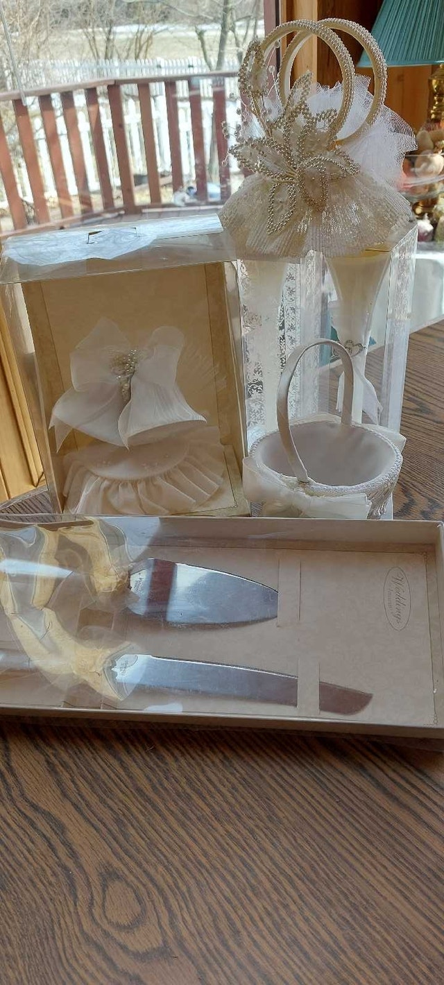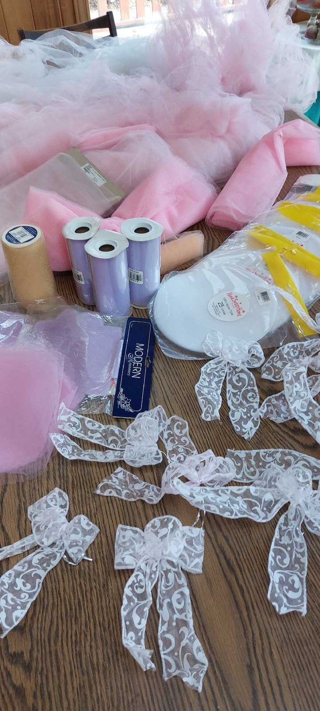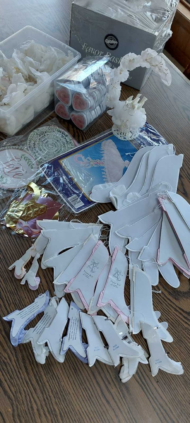 67 ceramic lillies to encase candied almonds, chocolates, or other treats. A beautiful gift for guests to take home from that beautiful day. 5 packs of wedding bubbles ( 6 containers per pack) 29 packs of place cards ( 8 cards per pack) Beautiful, heart-shaped box for guests to place envelopes in 12 dusty-rose organza fabric (52" x 62") for decorating chairs, arch, doorway, etc. Cake cutting set ( knife and server) Small basket (for money, flowers, or decoration) Three cake toppers ( one wedding bells, one wedding rings, one doves with wedding rings) Bride and groom candles ( be careful of glass ) Pink and white netting ( many, many yards) Tulle Shimmer for decorating and favour's ( purple and champagne colours) Pre-cut pink and purple tulle, 3 packs) 16 pre-cut white tulle 12 pre-made pink and white bows for decorating Four gorgeous ring-bearer pillows Two guest books One parasol, one paper parasol Box of silver baskets and boxes to fill (36 total) Gorgeous glass and lace crochet little hats for party favors Box of heart-shaped party favor tins (19) De ovations for party room including banners, and 30 tissue paper bells to hang from the ceiling