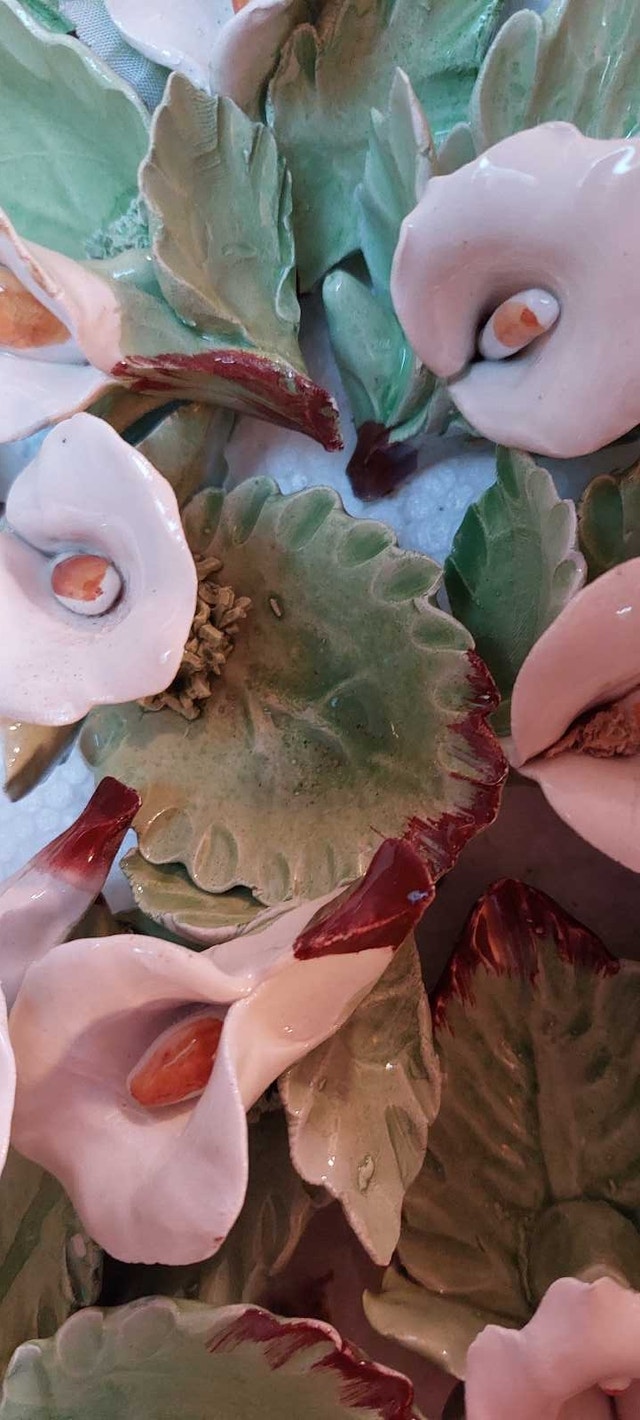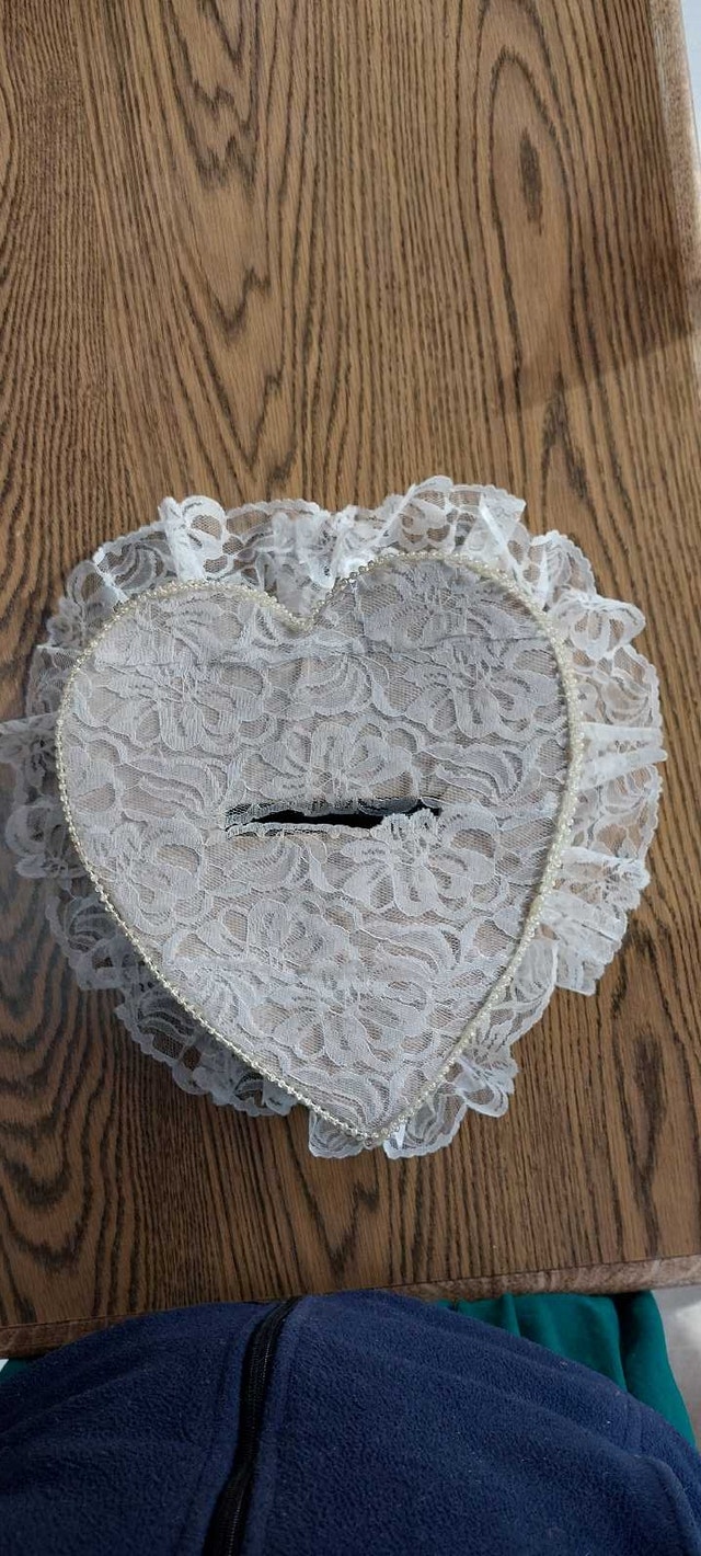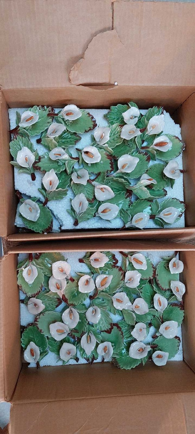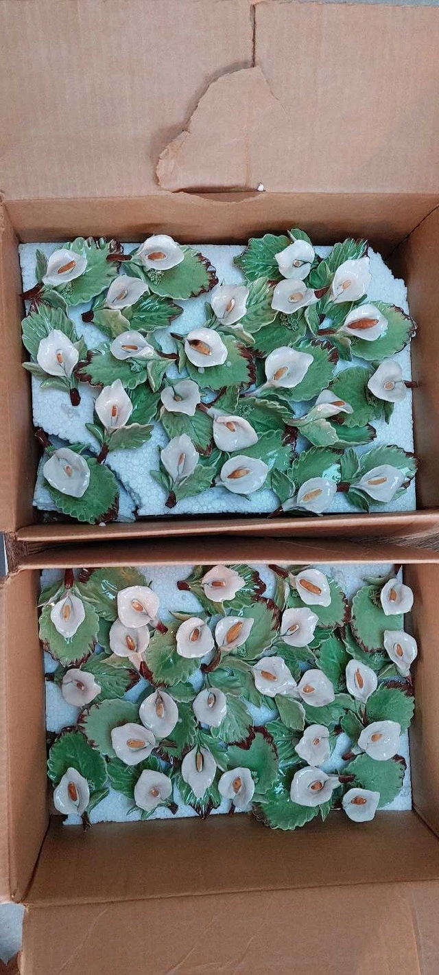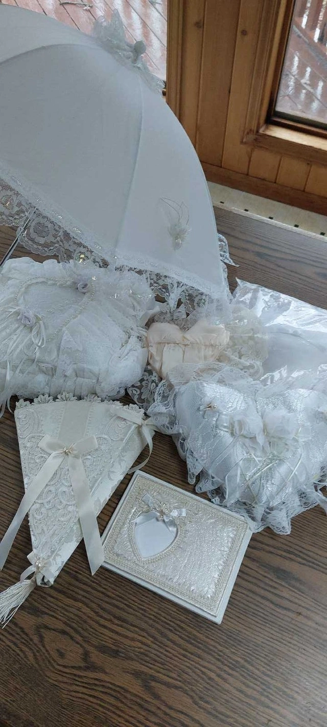 67 ceramic lillies to encase candied almonds, chocolates, or other treats. A beautiful gift for guests to take home from that beautiful day. 5 packs of wedding bubbles ( 6 containers per pack) 29 packs of place cards ( 8 cards per pack) Beautiful, heart-shaped box for guests to place envelopes in 12 dusty-rose organza fabric (52" x 62") for decorating chairs, arch, doorway, etc. Cake cutting set ( knife and server) Small basket (for money, flowers, or decoration) Three cake toppers ( one wedding bells, one wedding rings, one doves with wedding rings) Bride and groom candles ( be careful of glass ) Pink and white netting ( many, many yards) Tulle Shimmer for decorating and favour's ( purple and champagne colours) Pre-cut pink and purple tulle, 3 packs) 16 pre-cut white tulle 12 pre-made pink and white bows for decorating Four gorgeous ring-bearer pillows Two guest books One parasol, one paper parasol Box of silver baskets and boxes to fill (36 total) Gorgeous glass and lace crochet little hats for party favors Box of heart-shaped party favor tins (19) De ovations for party room including banners, and 30 tissue paper bells to hang from the ceiling