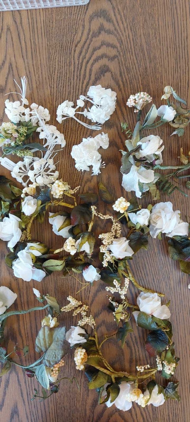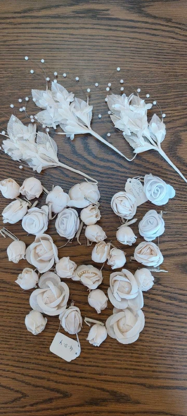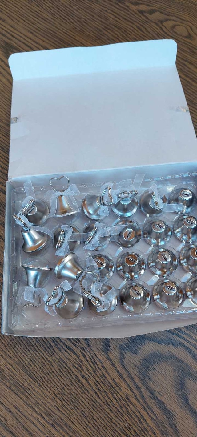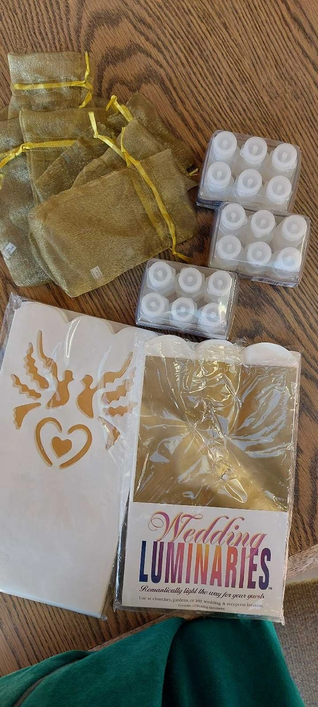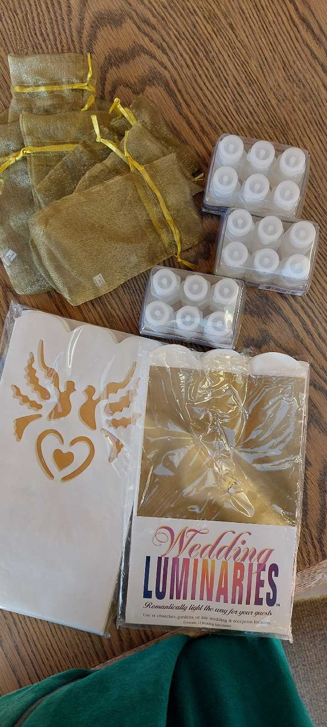 Box of celebration bells (23)(with tags) Three boxes of wedding bubbles (18) Two packages of Wedding Luminaries (24 total) Ten organza gift bags Beautiful table decorations Flower corsages for wedding party including 3 boutineres for men Decoration bows and table name cards