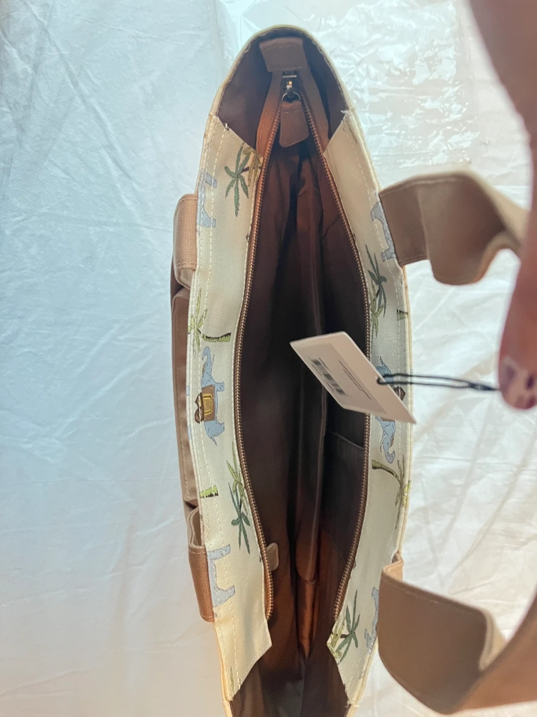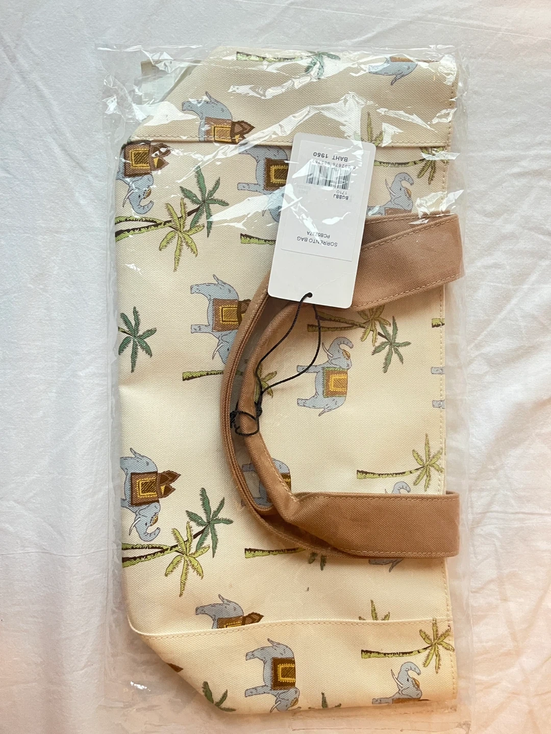This Jim Thompson Sorrento Bag is brand new and still in its original packaging! It features a charming elephant and palm tree pattern on a cream-colored background. Perfect for adding a touch of whimsy to your everyday style