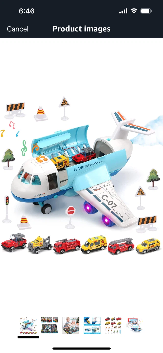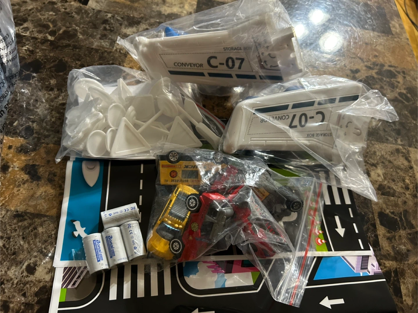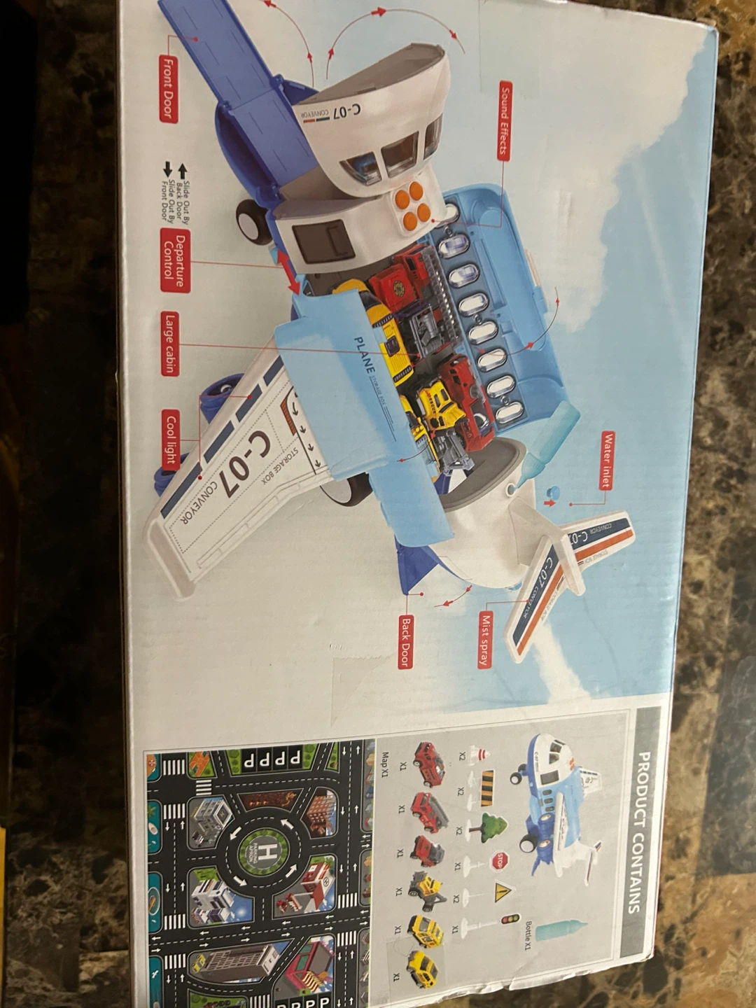This new toy transport airplane is perfect for kids aged 3 and up! It includes several toy cars and traffic accessories for hours of imaginative play. It features light and music, a spray function, and a rush out feature for added fun!