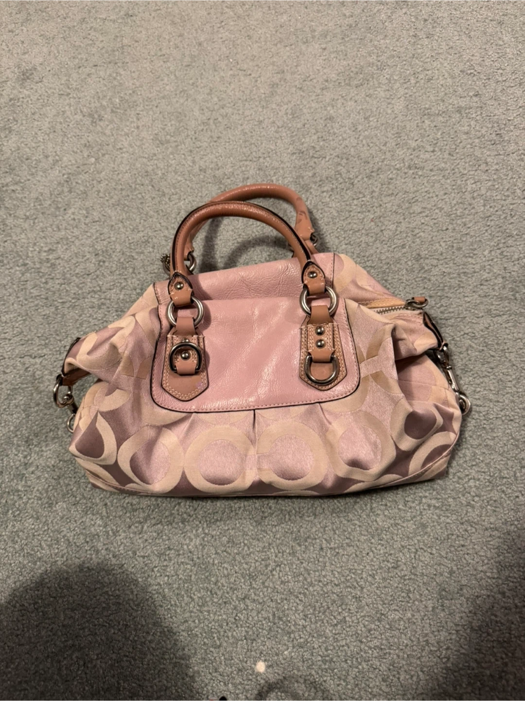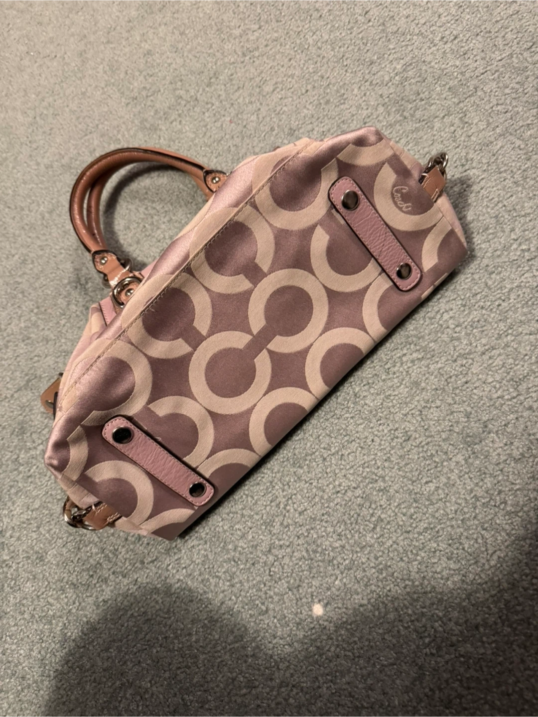 Selling a cute Coach satchel handbag. It's in good condition and has a fun, patterned design. Perfect for everyday use! Some marks on the inside of the handles as shown in the image