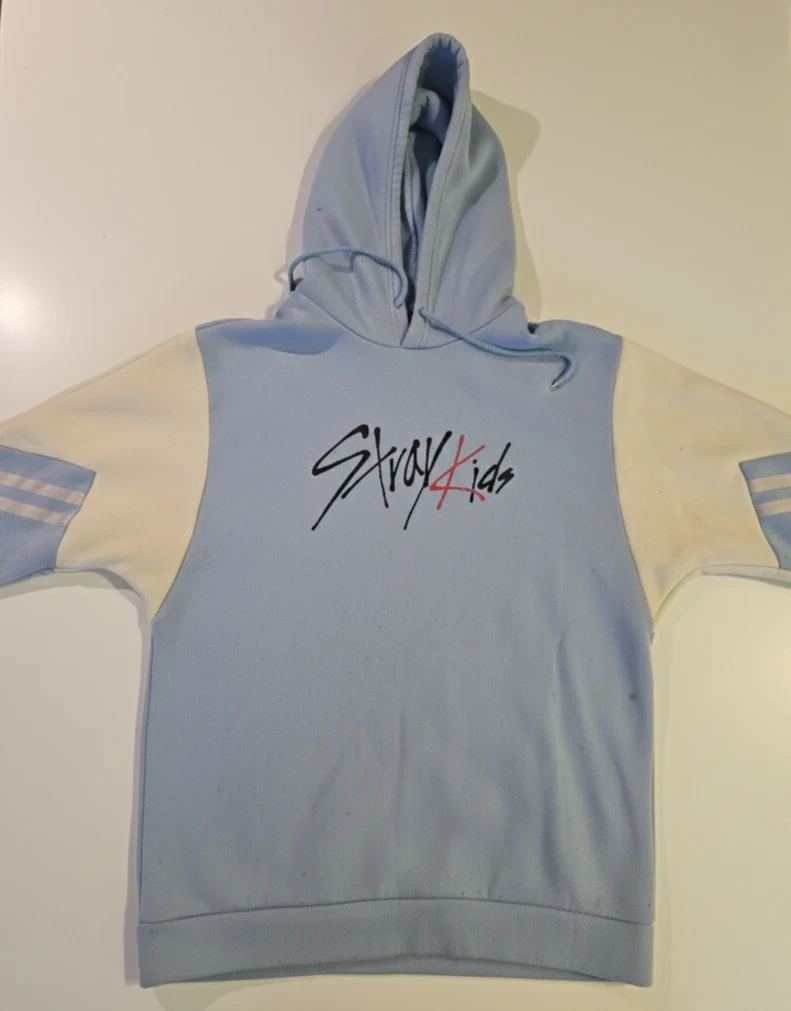 Selling a Stray Kids hoodie! It's a light blue colour with cream-coloured sleeves and the Stray Kids logo on the front. A comfy and stylish way to show your love for the group. Size adults L
