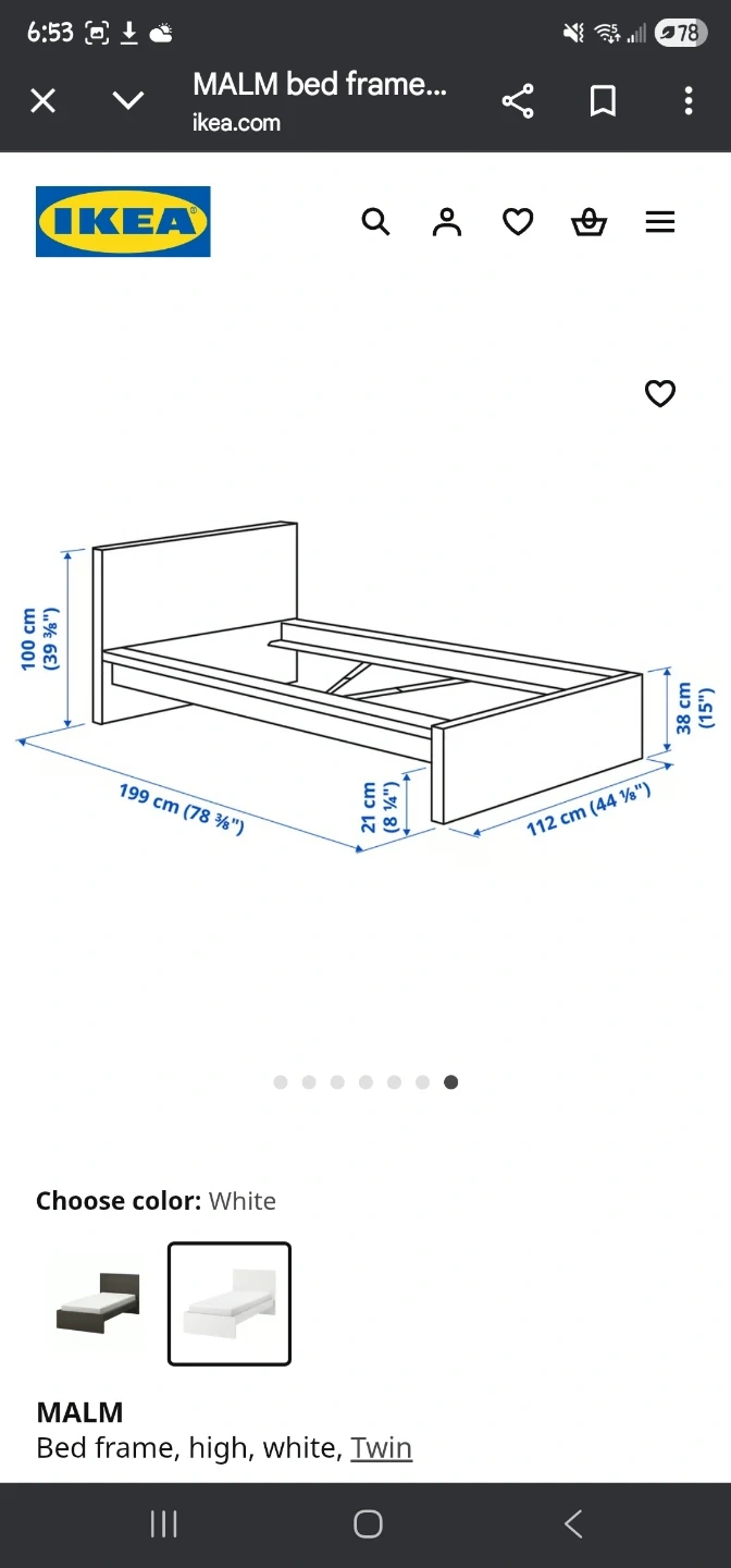Selling a white IKEA MALM bed frame, high, in twin size. The dimensions are approximately 199 cm (78 3/8") in length, 112 cm (44 1/8") in width, and 100 cm (39 3/8") in height. Perfect for a smaller bedroom or guest room! Never slept on.