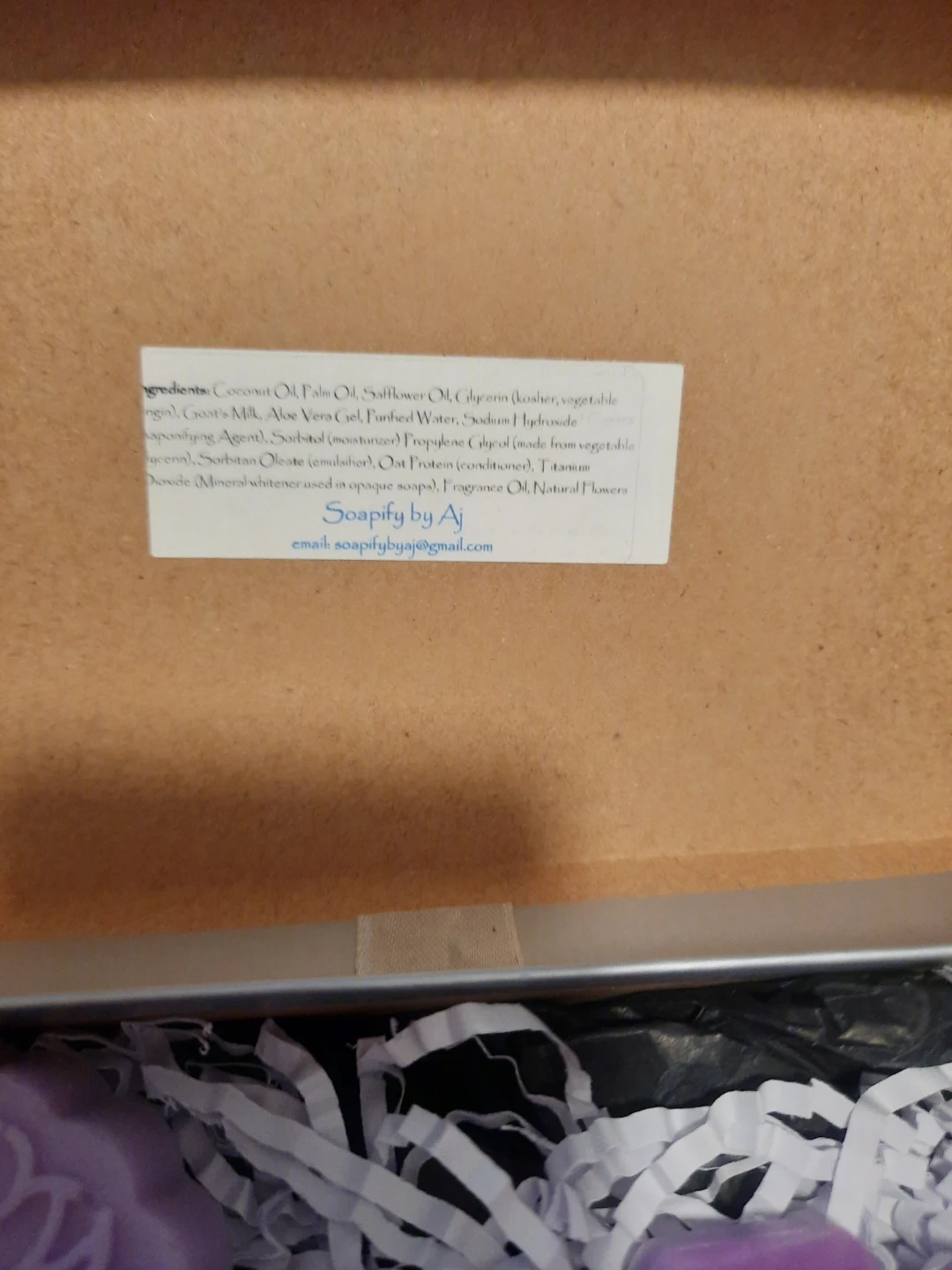 The ingredients include coconut oil, palm oil, safflower oil, glycerin, goat's milk, aloe vera gel, purified water, sodium hydroxide, sorbitol, sorbitan oleate, oat protein, titanium dioxide, fragrance oil, and natural flowers