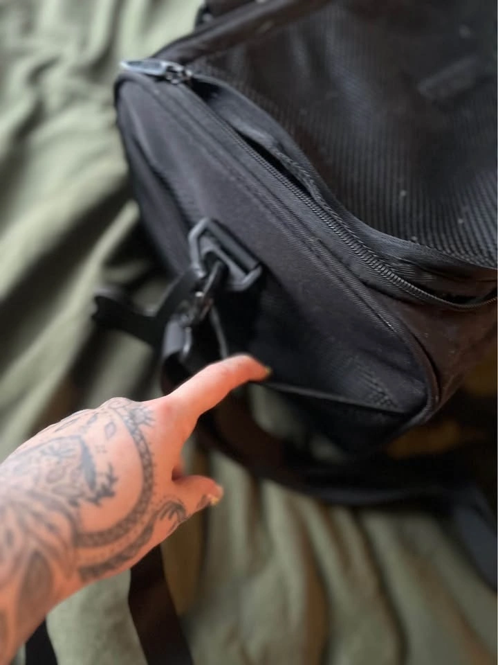 Has a side pocket and a luggage strap (to secure on top of a suitcase when walking around outside of the plane)