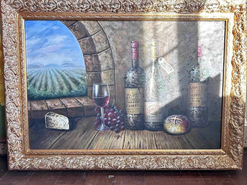 This rustic still life painting features aged wine bottles, a glass of red wine, grapes, and cheese set against an arched stone window overlooking a serene vineyard landscape. The richly textured brushwork and ornate gold frame give it a classic, old-world charm perfect for kitchens, dining rooms, or wine-themed spaces.