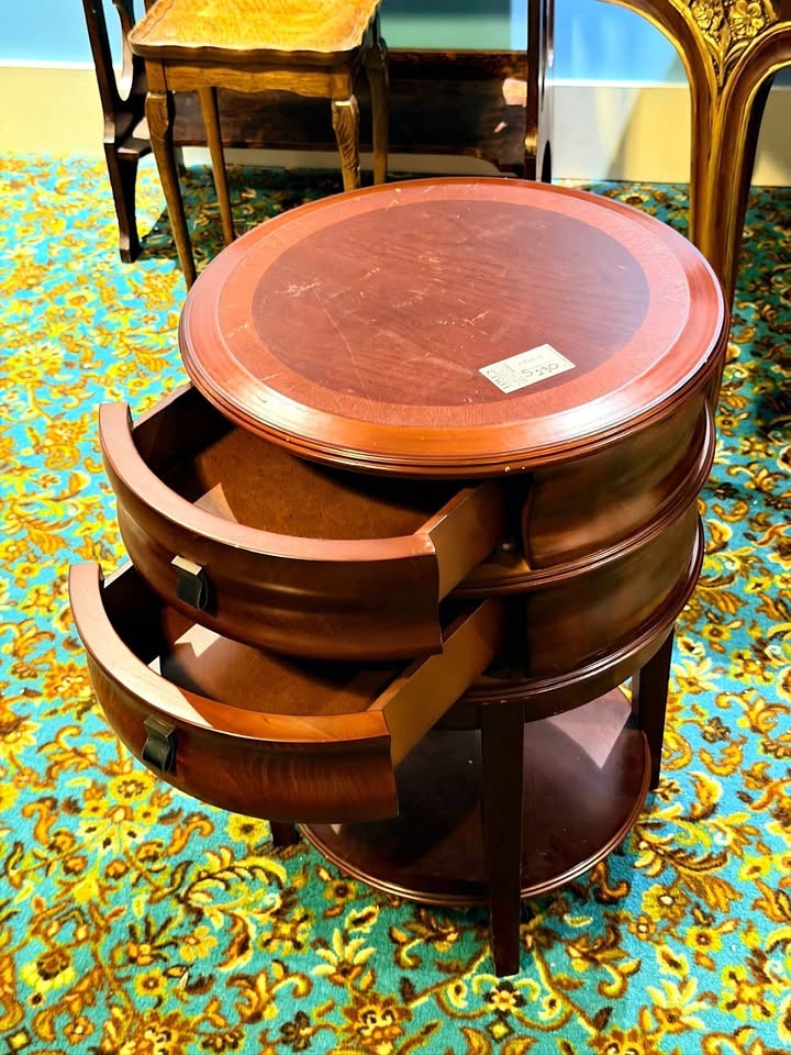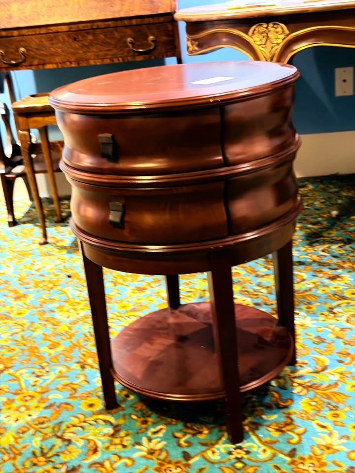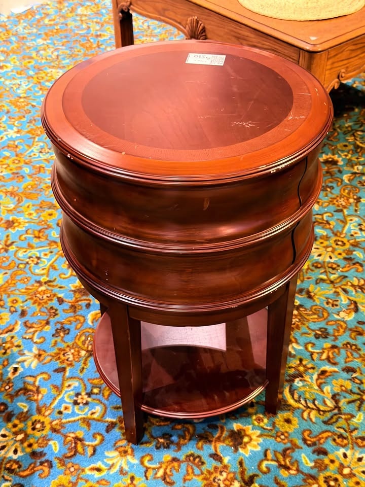 Round solid wood table in a rich reddish-brown finish with a classic vintage style. Features smooth curved edges, a sturdy build, and a lower shelf, showing light surface wear consistent with age while remaining stable and well maintained.