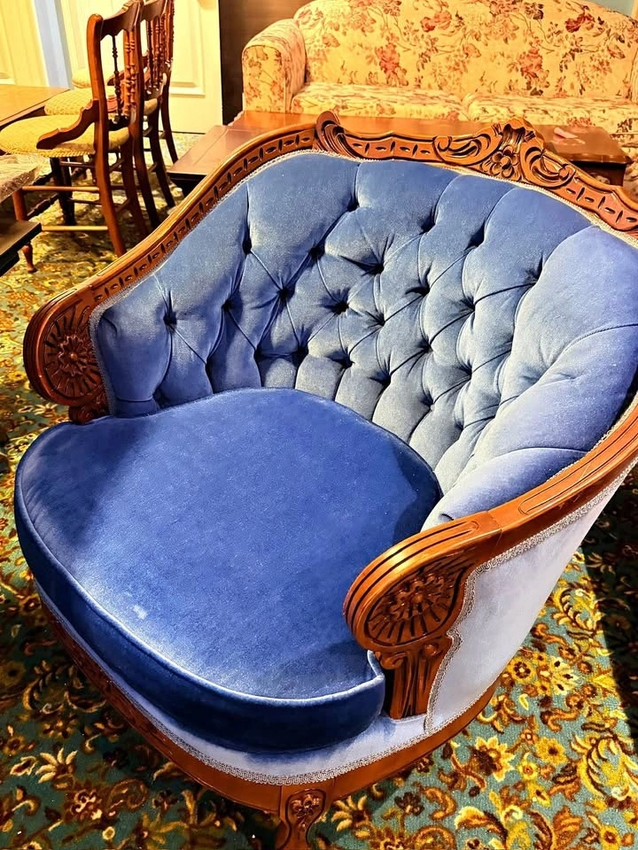 Elegant vintage sofa upholstered in a soft light blue fabric with deep button tufting and a carved solid wood frame. Classic curved silhouette with detailed woodwork, showing light age-appropriate wear while remaining sturdy, comfortable, and visually striking.