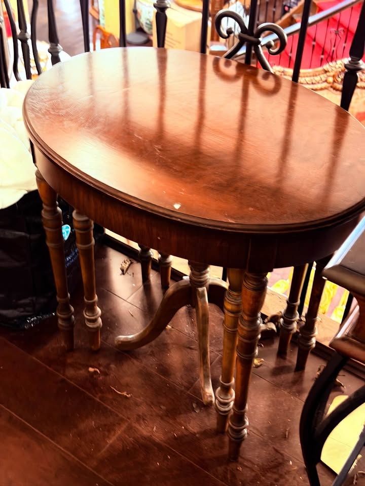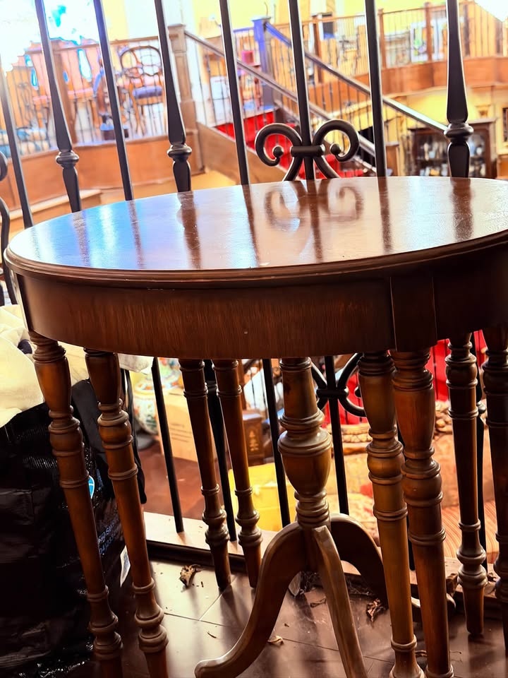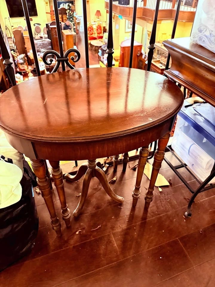 Solid wood table in a rich medium-brown finish with a classic vintage style and turned legs. Features a smooth oval top with fold-down leaves, showing light surface wear consistent with age while remaining sturdy, stable, and well maintained.